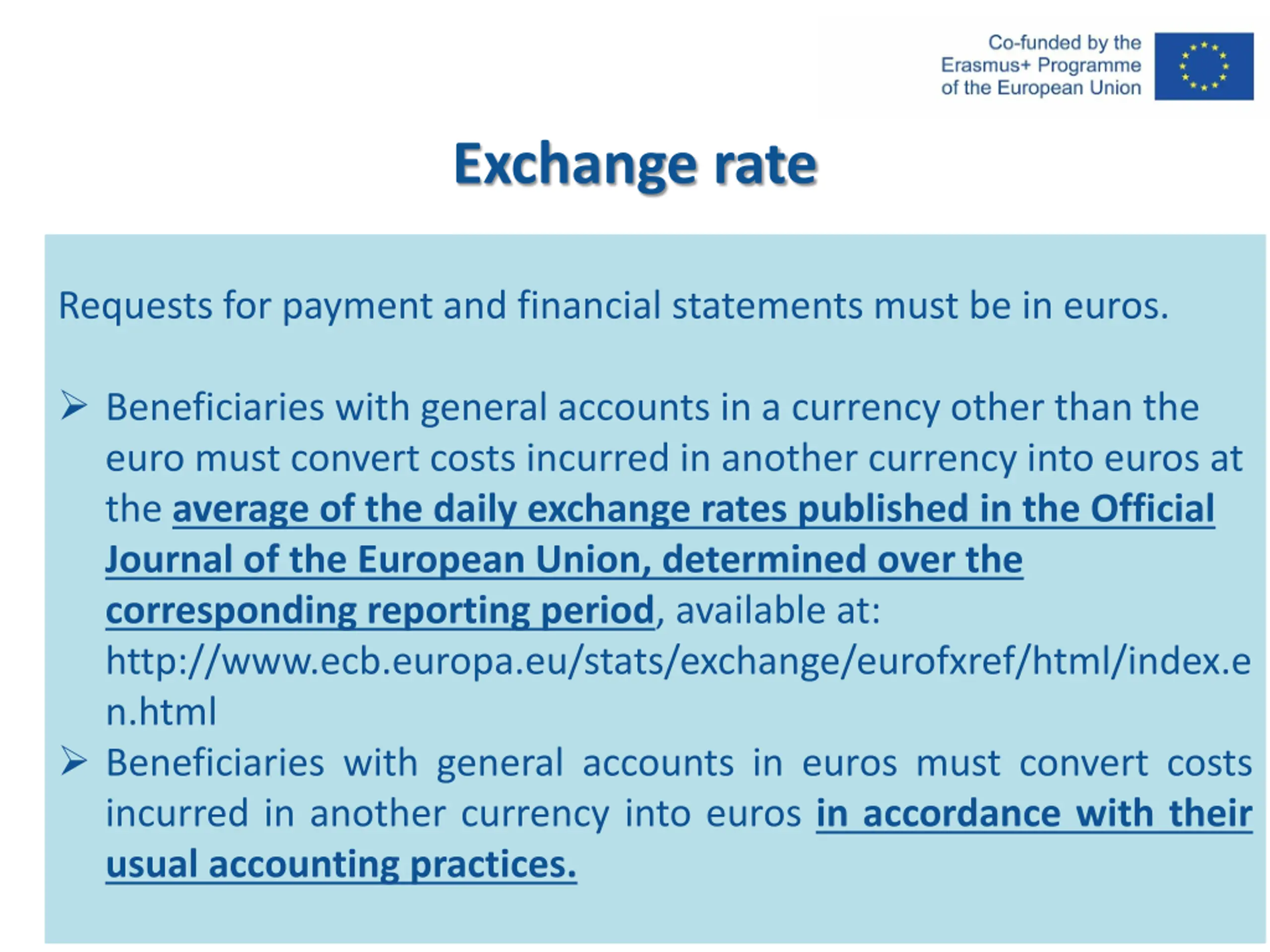 Exchange rate Requests for payment and financial statements must be in euros. Beneficiaries with general accounts in a currency other than the euro must convert costs incurred in another currency into euros at the average of the daily exchange rates published in the Official Journal of the European Union, determined over the corresponding reporting period, available at: http://www.ecb.europa.eu/stats/exchange/eurofxref/html/index.e n.html Beneficiaries with general accounts in euros must convert costs incurred in another currency into euros in accordance with their usual accounting practices. 30