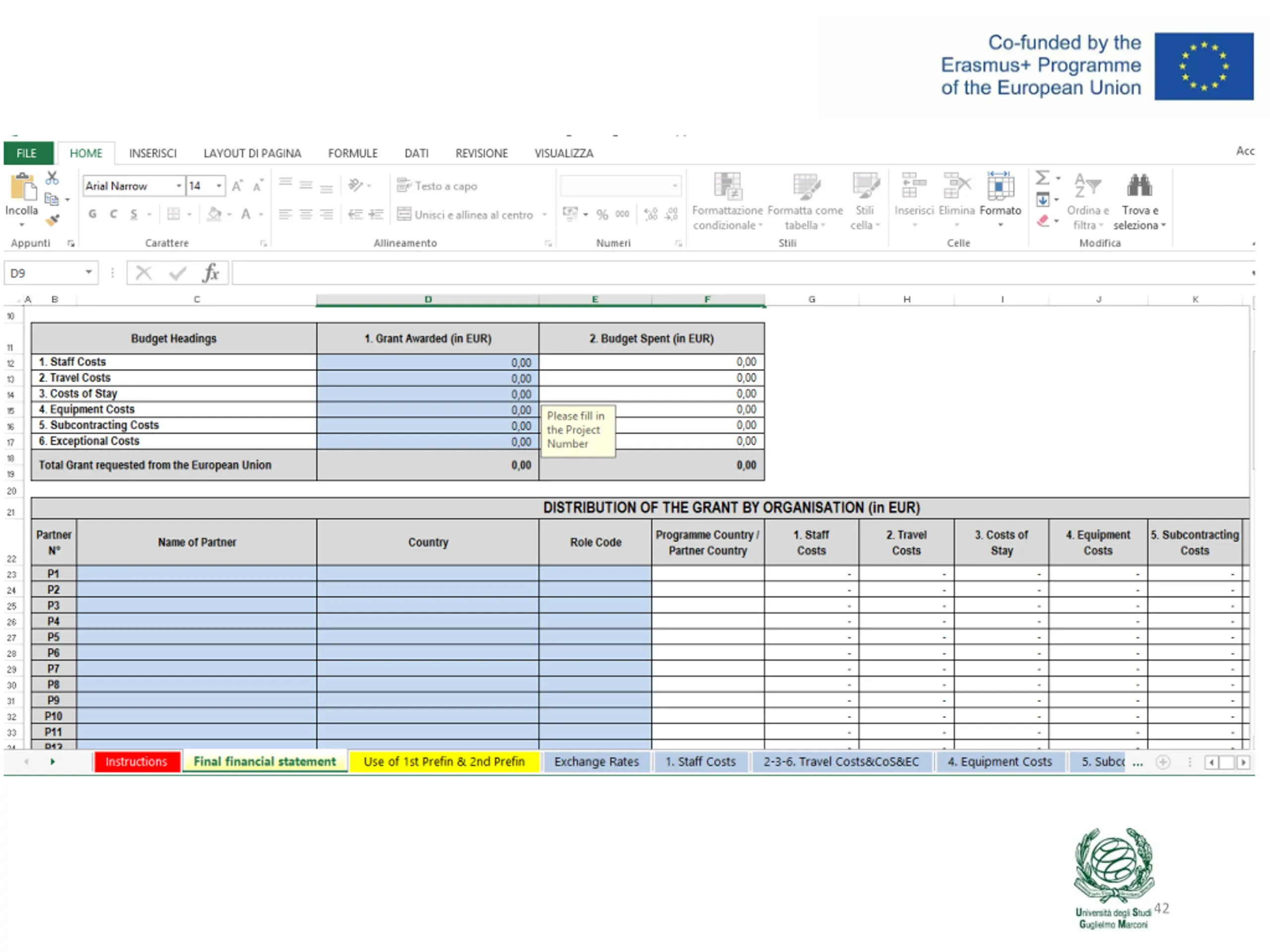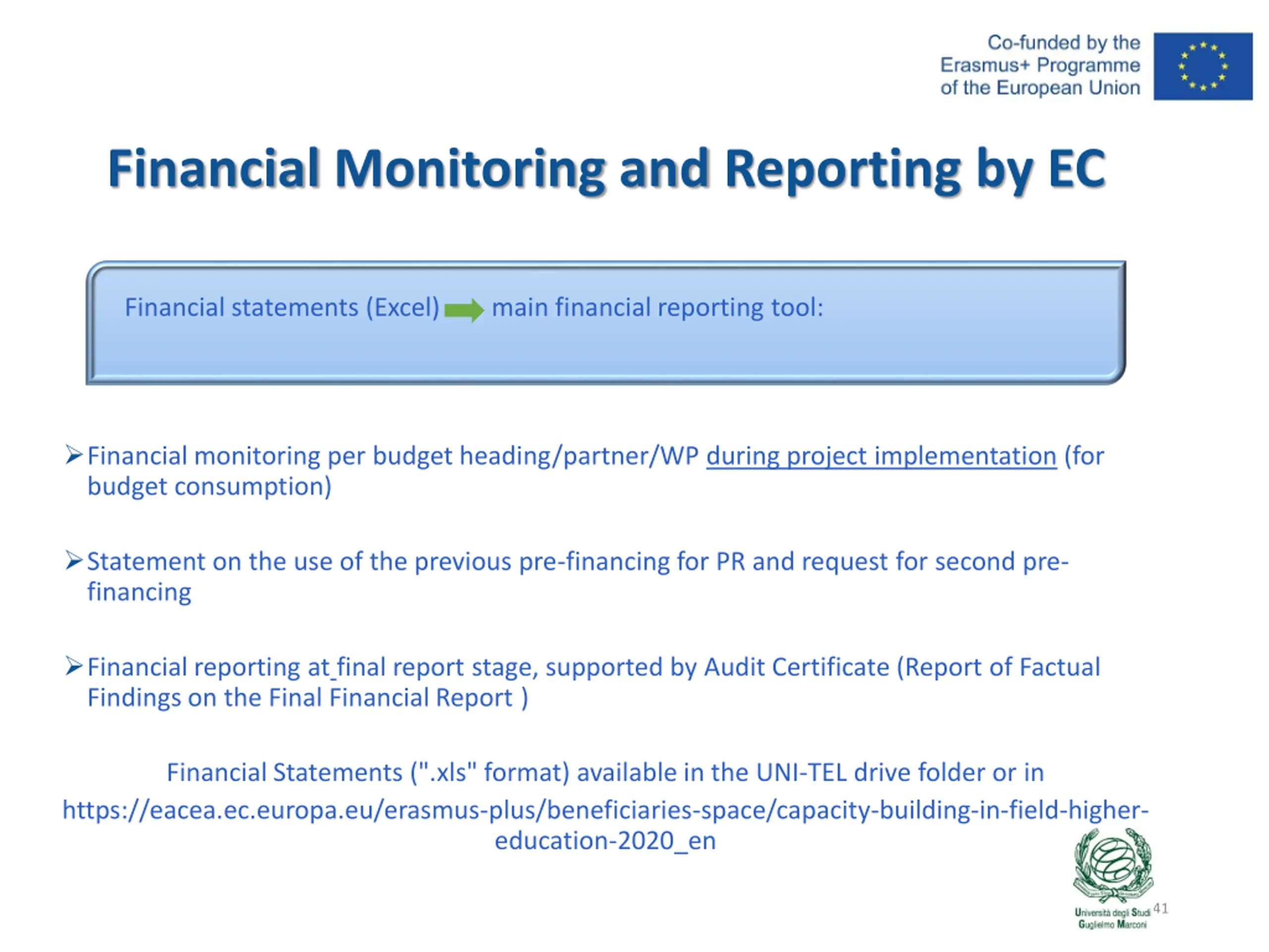 Financial Monitoring and Reporting by EC Financial statements (Excel) main financial reporting tool: Financial monitoring per budget heading/partner/WP during project implementation (for budget consumption) Statement on the use of the previous pre-financing for PR and request for second pre- financing Financial reporting at final report stage, supported by Audit Certificate (Report of Factual Findings on the Final Financial Report ) Financial Statements (".xls" format) available in the UNI-TEL drive folder or in https://eacea.ec.europa.eu/erasmus-plus/beneficiaries-space/capacity-building-in-field-higher- education-2020_en 41