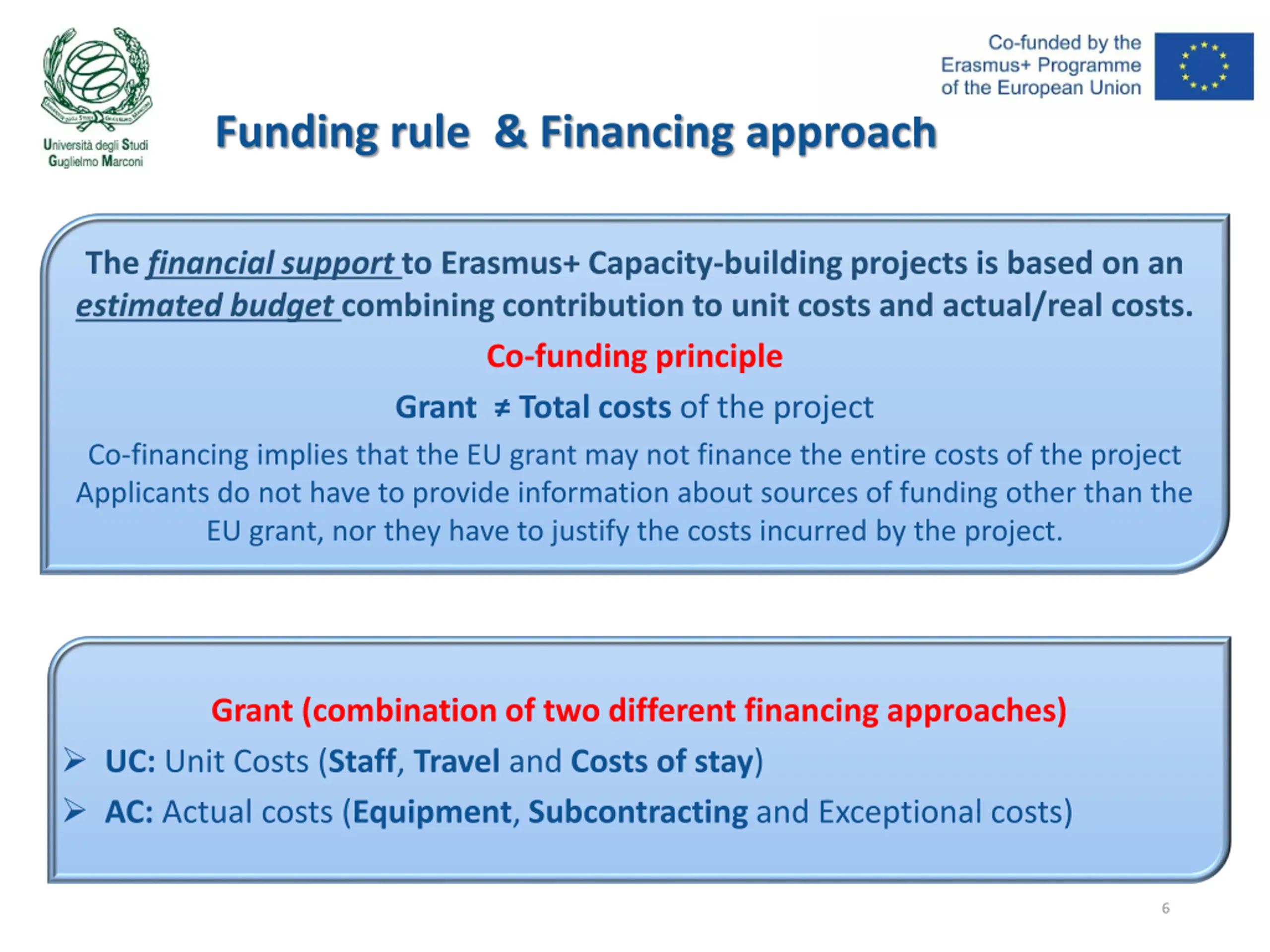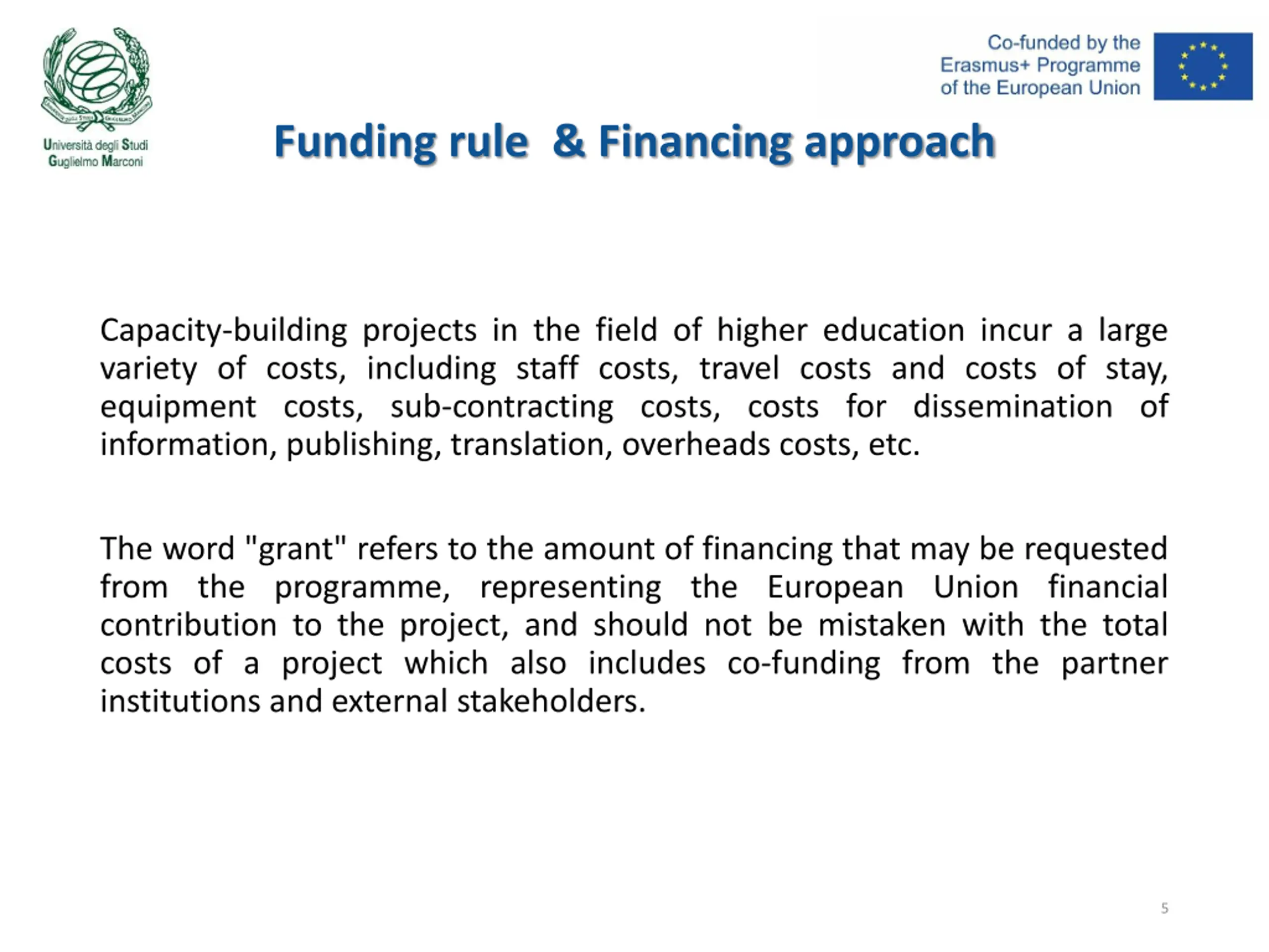 Funding rule & Financing approach Capacity-building projects in the field of higher education incur a large variety of costs, including staff costs, travel costs and costs of stay, equipment costs, sub-contracting costs, costs for dissemination of information, publishing, translation, overheads costs, etc. The word "grant" refers to the amount of financing that may be requested from the programme, representing the European Union financial contribution to the project, and should not be mistaken with the total costs of a project which also includes co-funding from the partner institutions and external stakeholders. 5