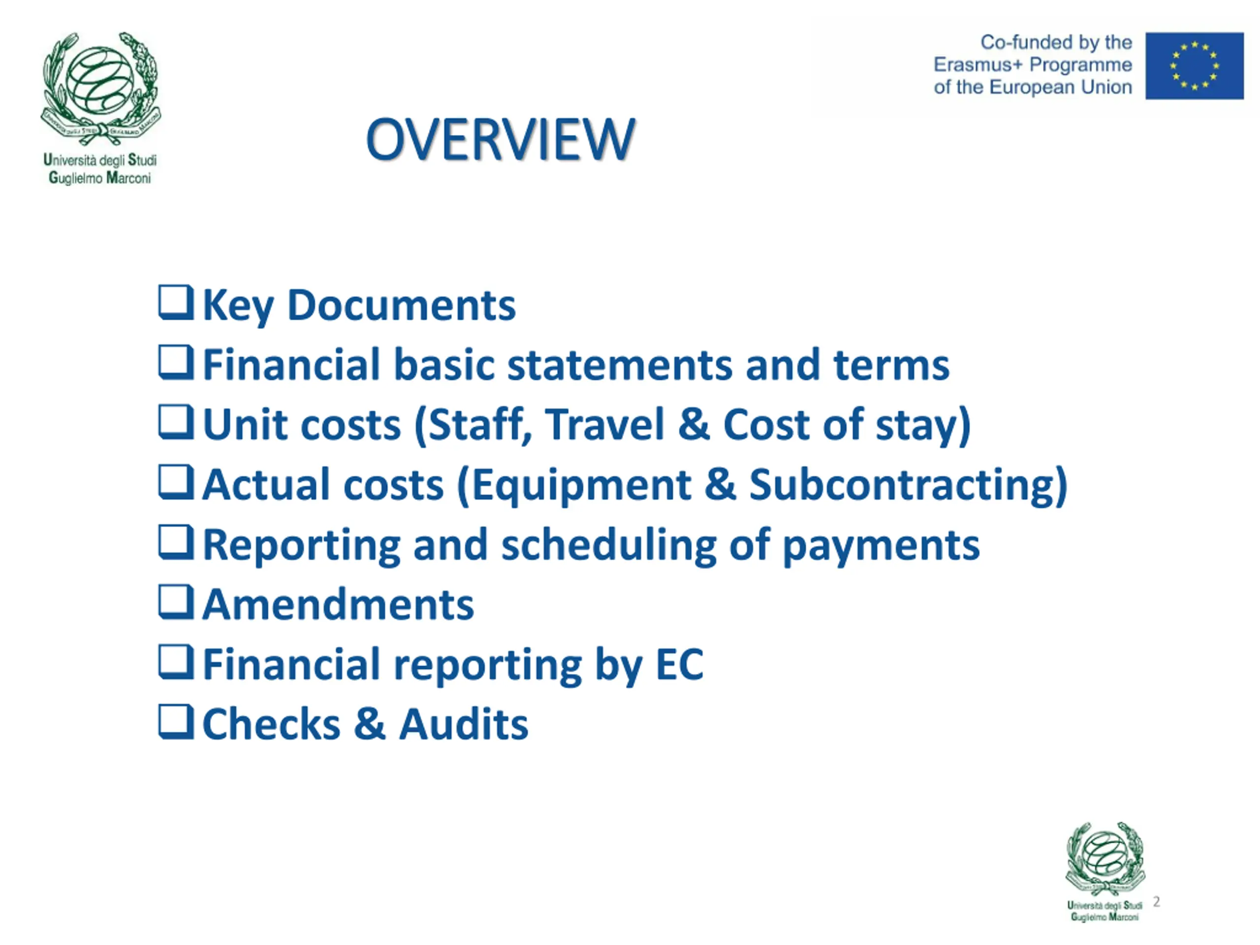 OVERVIEW OVERVIEW Key Documents Financial basic statements and terms Unit costs (Staff, Travel & Cost of stay) Actual costs (Equipment & Subcontracting) Reporting and scheduling of payments Amendments Financial reporting by EC Checks & Audits 2