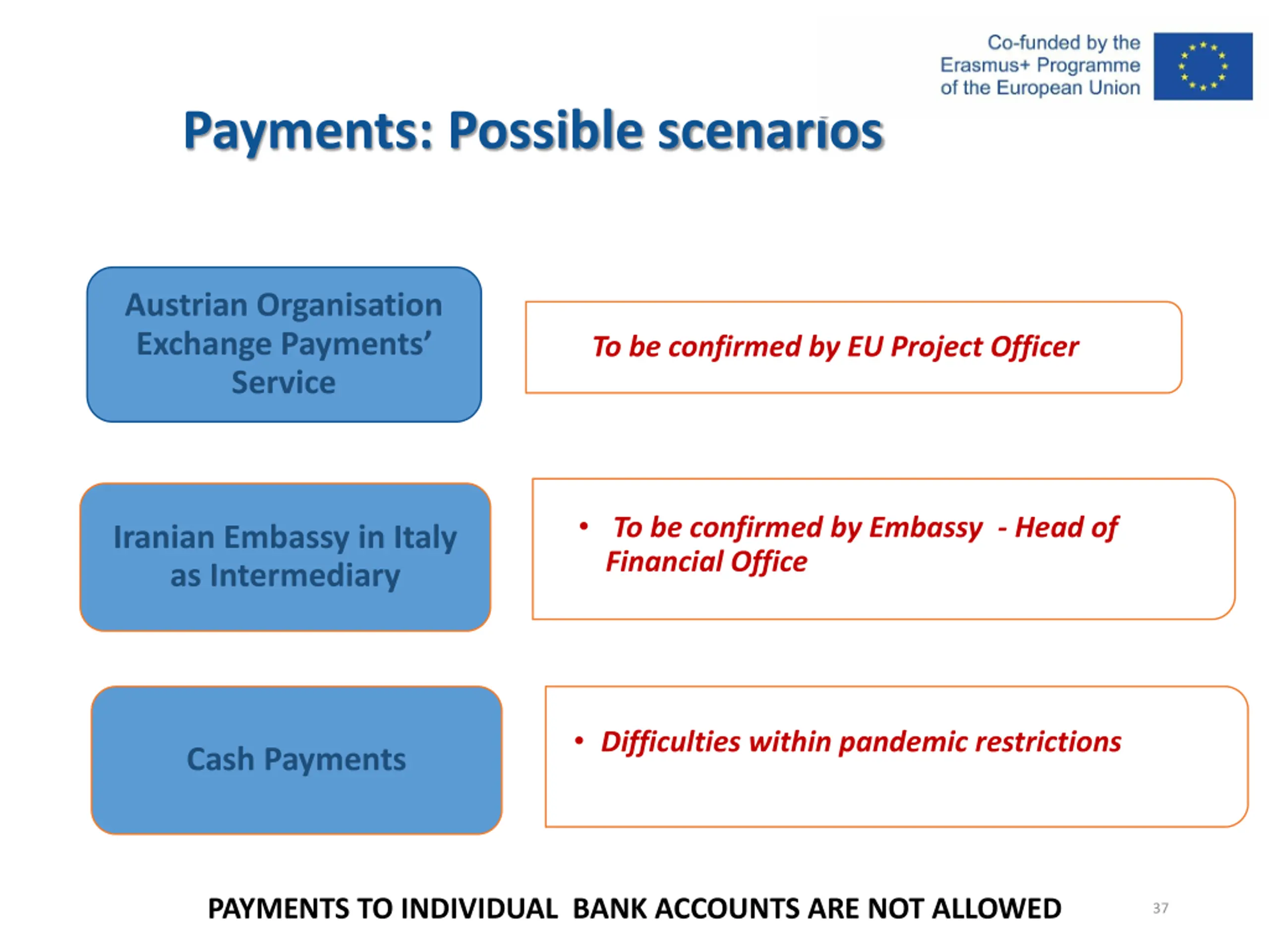 Payments: Possible scenarios Austrian Organisation Exchange Payments Service To be confirmed by EU Project Officer To be confirmed by Embassy - Head of Financial Office Iranian Embassy in Italy as Intermediary Difficulties within pandemic restrictions Cash Payments PAYMENTS TO INDIVIDUAL BANK ACCOUNTS ARE NOT ALLOWED 37