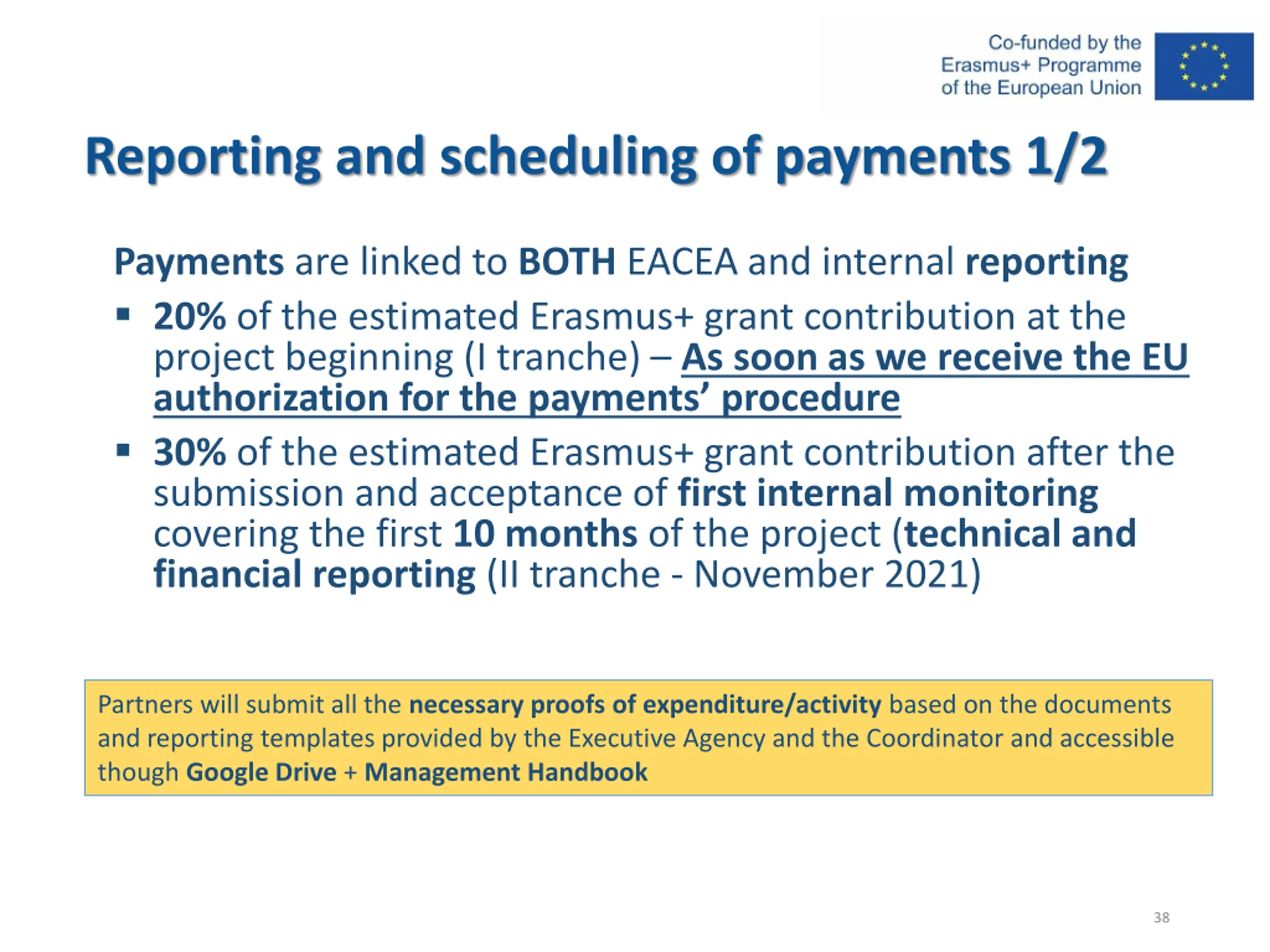 Reporting and scheduling of payments 1/2 Payments are linked to BOTH EACEA and internal reporting 20% of the estimated Erasmus+ grant contribution at the project beginning (I tranche) As soon as we receive the EU authorization for the payments procedure 30% of the estimated Erasmus+ grant contribution after the submission and acceptance of first internal monitoring covering the first 10 months of the project (technical and financial reporting (II tranche - November 2021) Partners will submit all the necessary proofs of expenditure/activity based on the documents and reporting templates provided by the Executive Agency and the Coordinator and accessible though Google Drive + Management Handbook 38