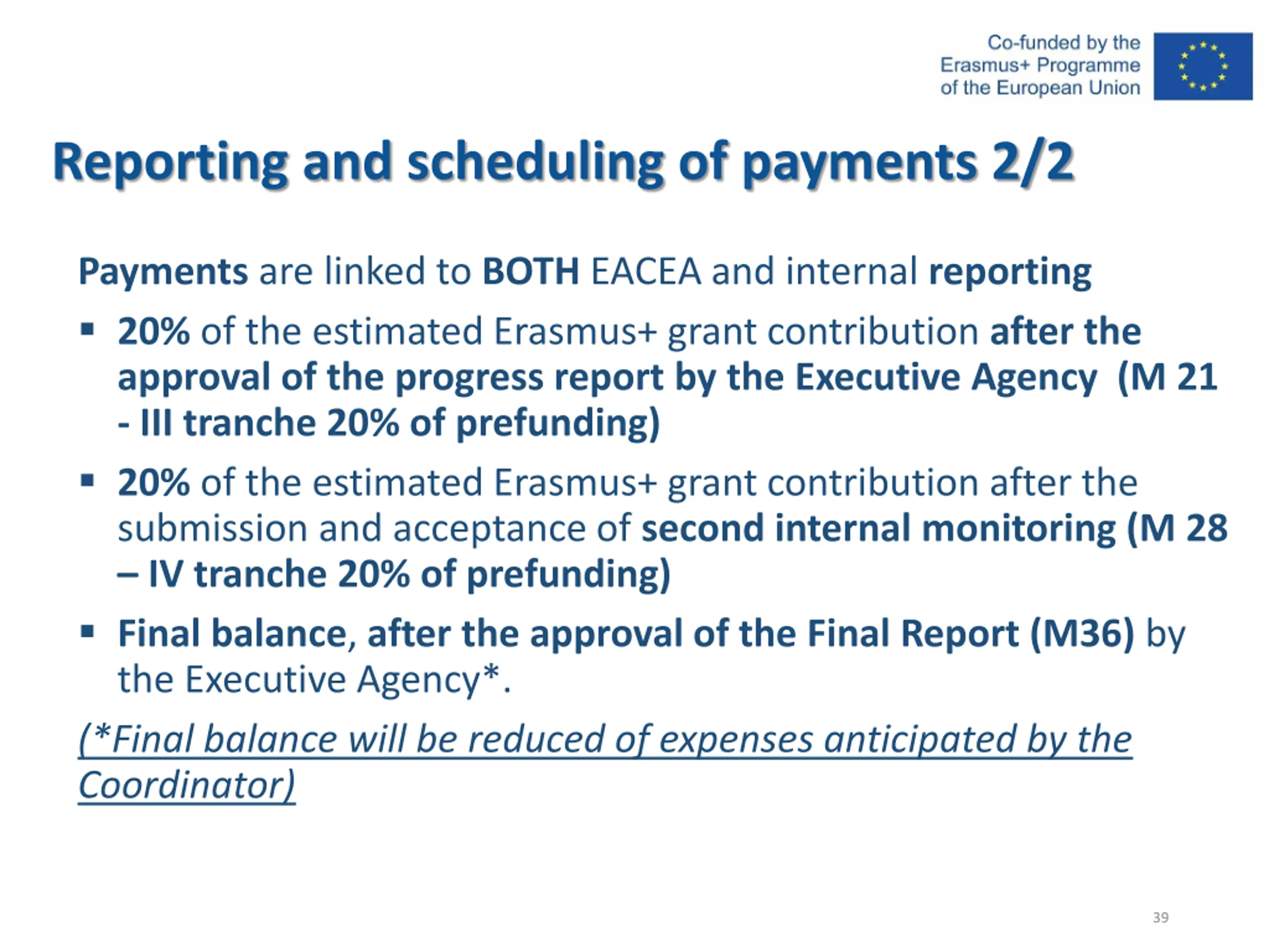 Reporting and scheduling of payments 2/2 Payments are linked to BOTH EACEA and internal reporting 20% of the estimated Erasmus+ grant contribution after the approval of the progress report by the Executive Agency (M 21 - III tranche 20% of prefunding) 20% of the estimated Erasmus+ grant contribution after the submission and acceptance of second internal monitoring (M 28 IV tranche 20% of prefunding) Final balance, after the approval of the Final Report (M36) by the Executive Agency*. (*Final balance will be reduced of expenses anticipated by the Coordinator) 39