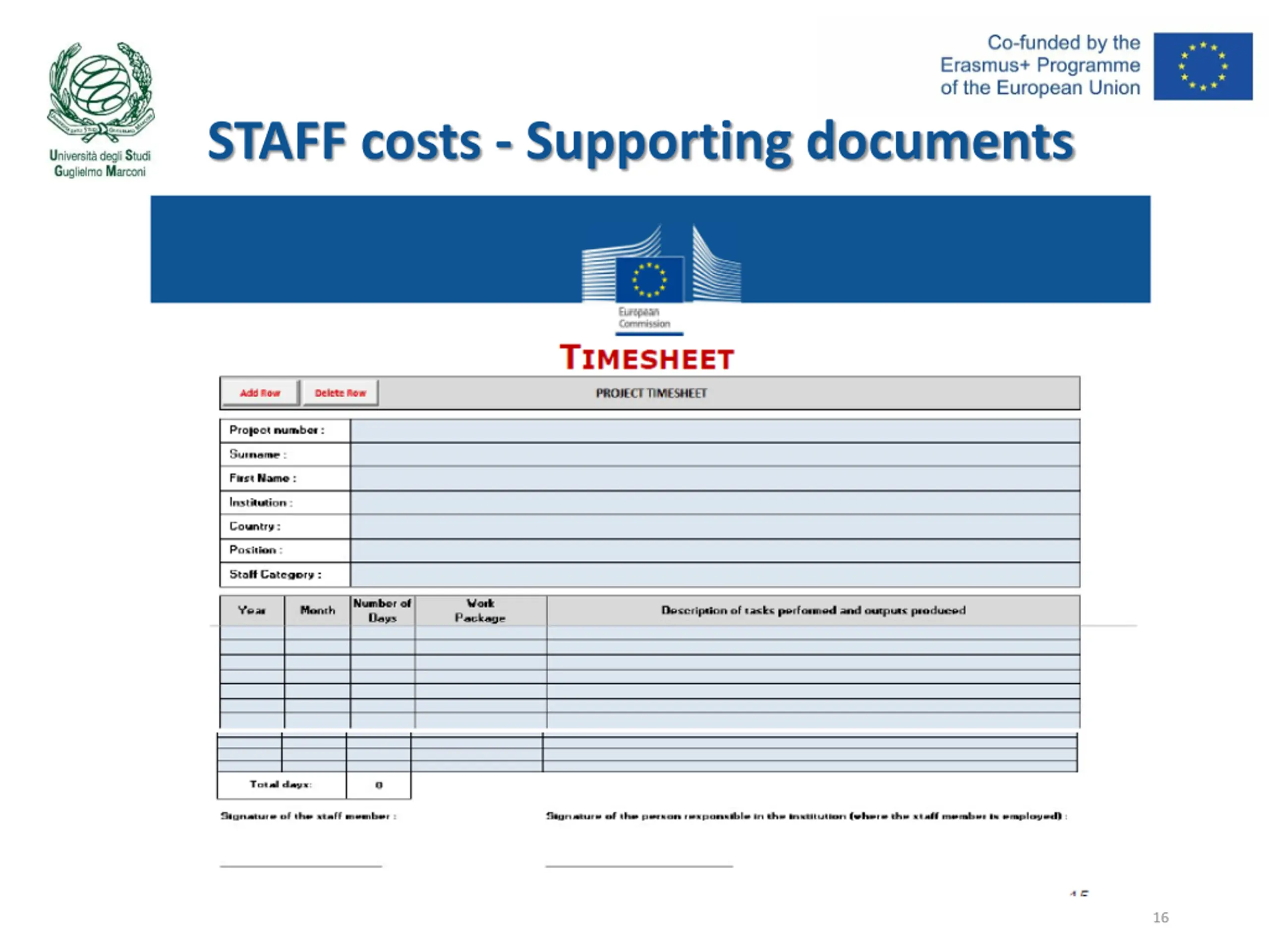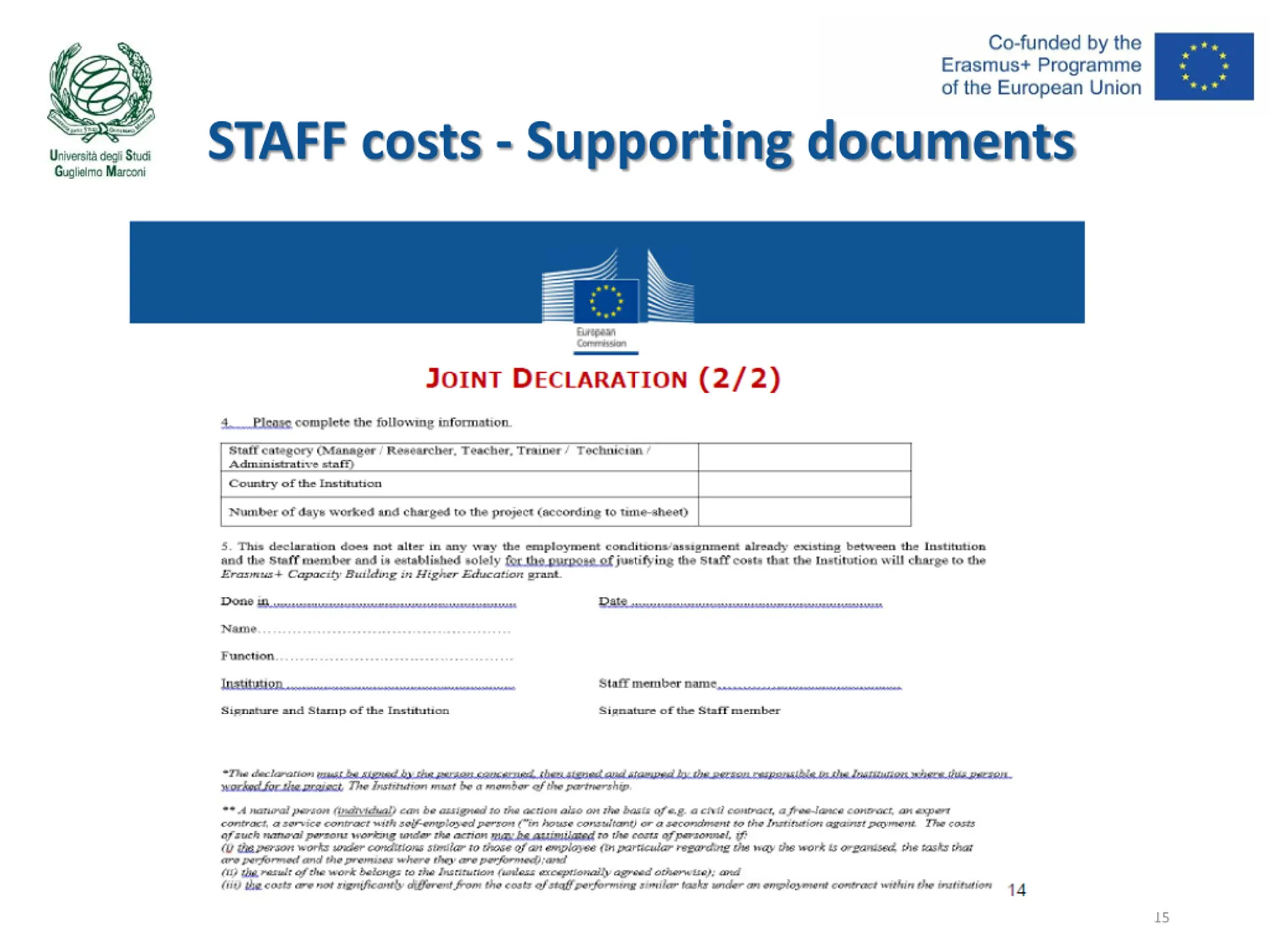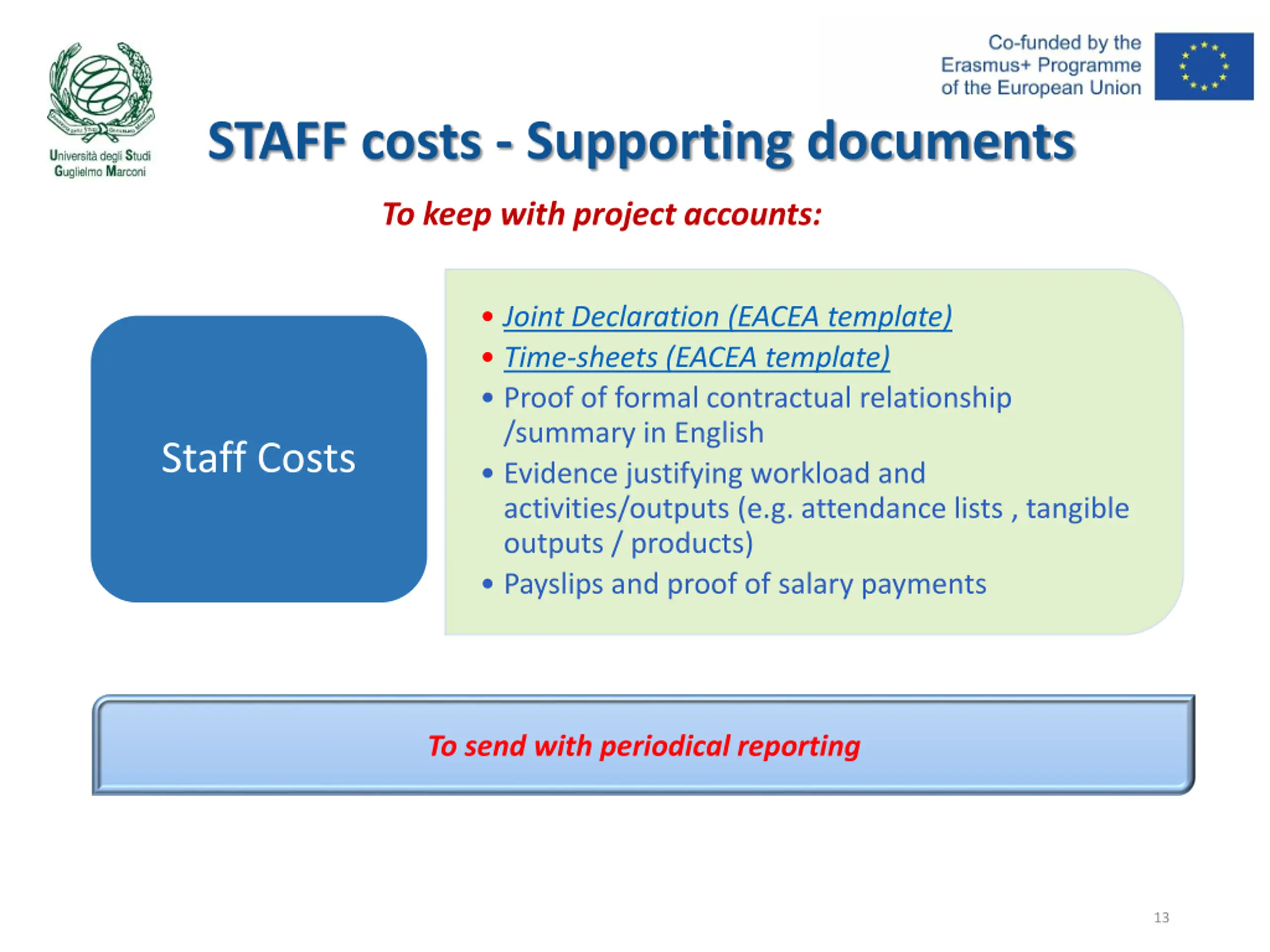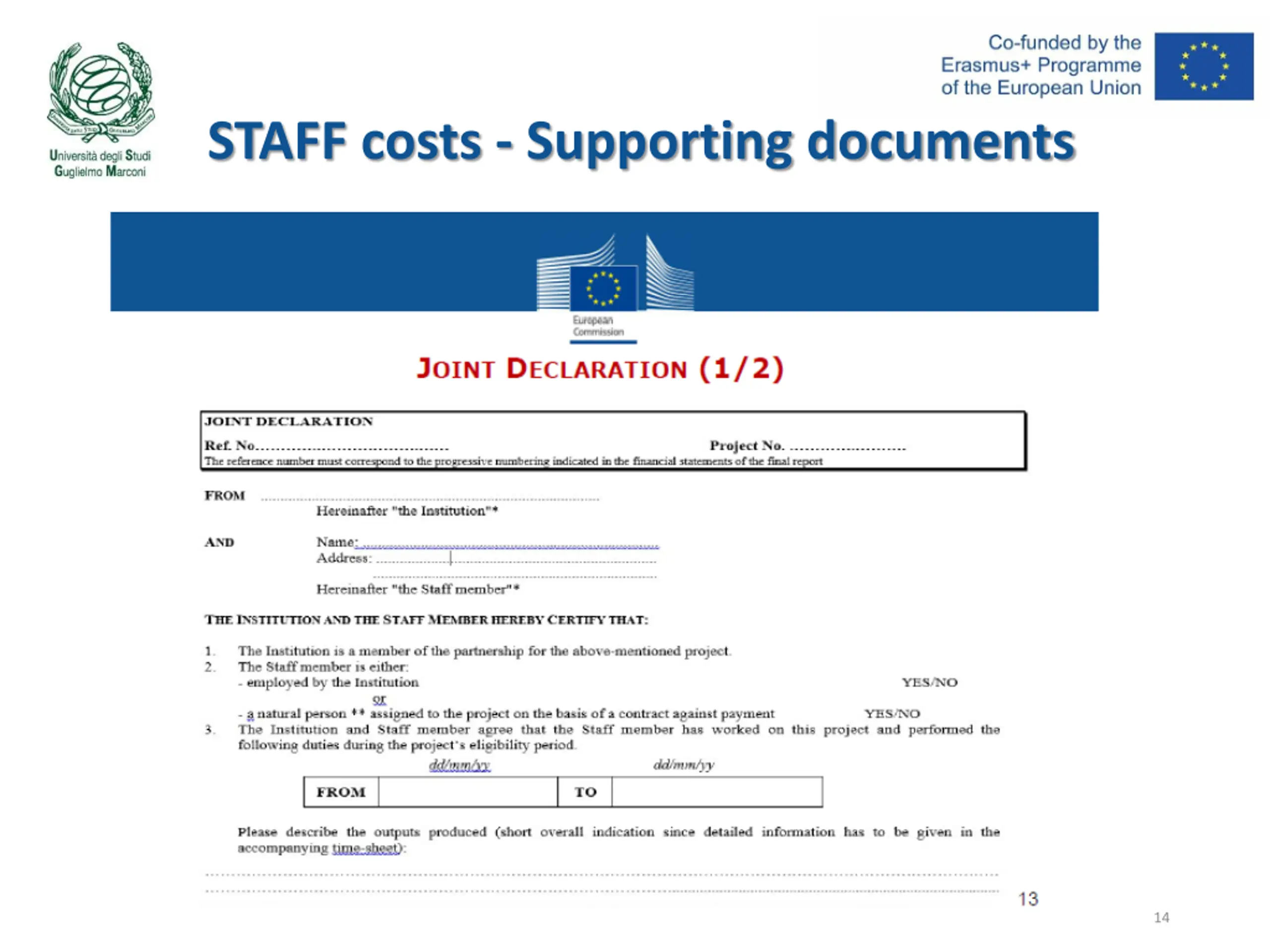 STAFF costs - Supporting documents To keep with project accounts: Joint Declaration (EACEA template) Time-sheets (EACEA template) Joint Declaration (EACEA template) Time-sheets (EACEA template) Joint Declaration (EACEA template) Time-sheets (EACEA template) Proof of formal contractual relationship /summary in English Evidence justifying workload and activities/outputs (e.g. attendance lists , tangible outputs / products) Payslips and proof of salary payments Staff Costs To send with periodical reporting 13