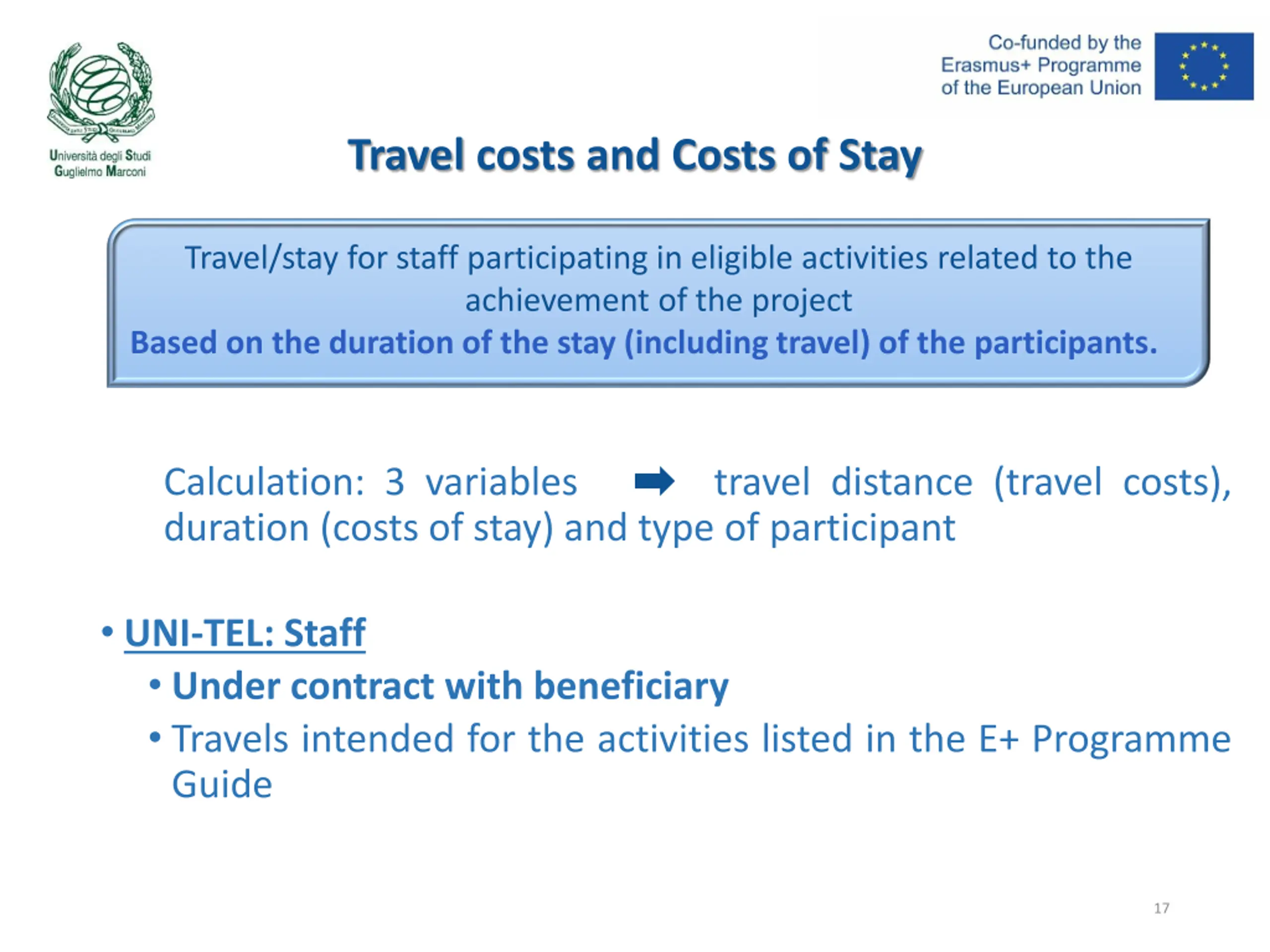 Travel costs and Costs of Stay Travel/stay for staff participating in eligible activities related to the achievement of the project Based on the duration of the stay (including travel) of the participants. Calculation: 3 variables duration (costs of stay) and type of participant travel distance (travel costs), UNI-TEL: Staff Under contract with beneficiary Travels intended for the activities listed in the E+ Programme Guide 17