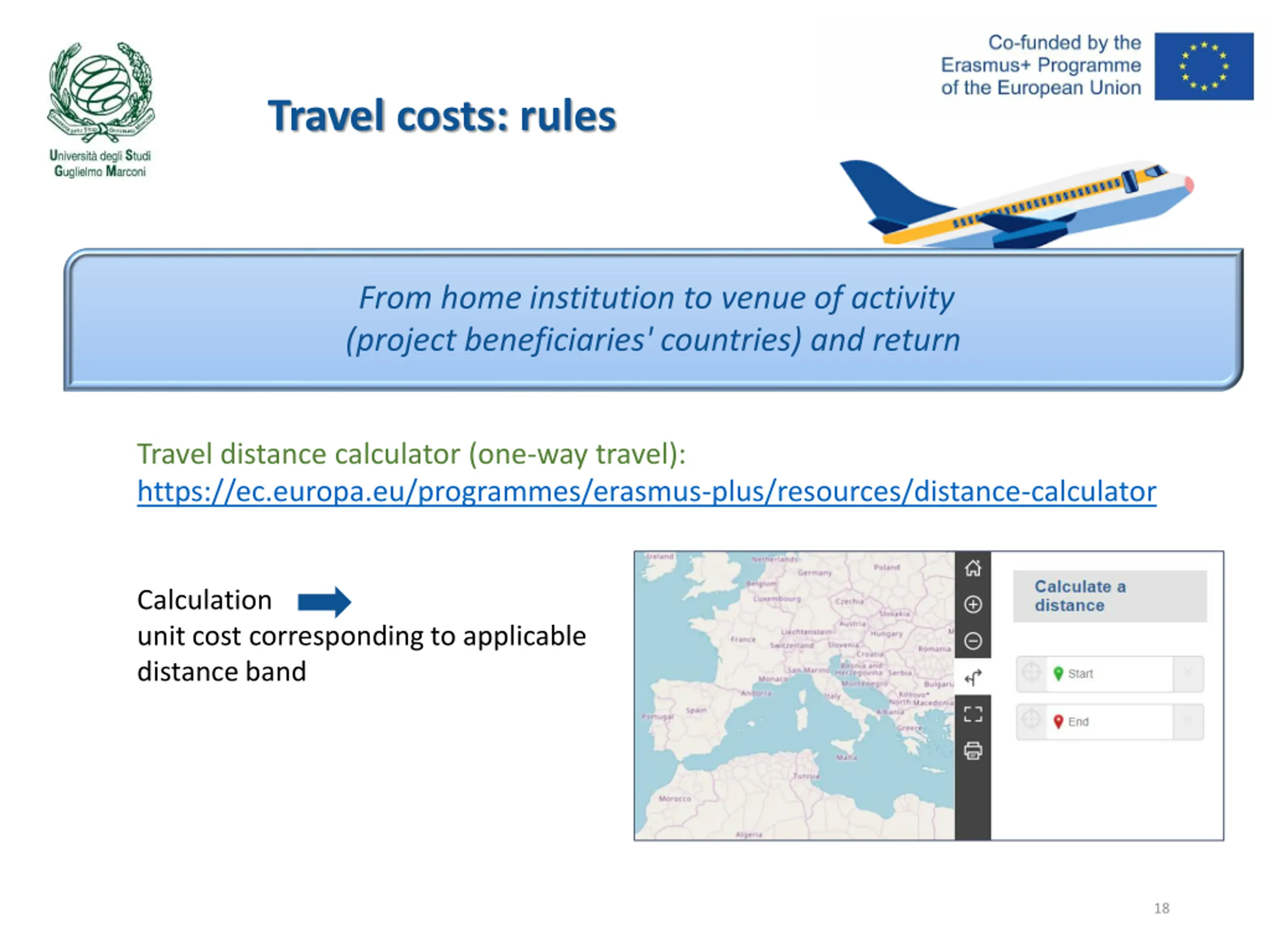 Travel costs: rules From home institution to venue of activity (project beneficiaries' countries) and return Travel distance calculator (one-way travel): https://ec.europa.eu/programmes/erasmus-plus/resources/distance-calculator Calculation unit cost corresponding to applicable distance band 18