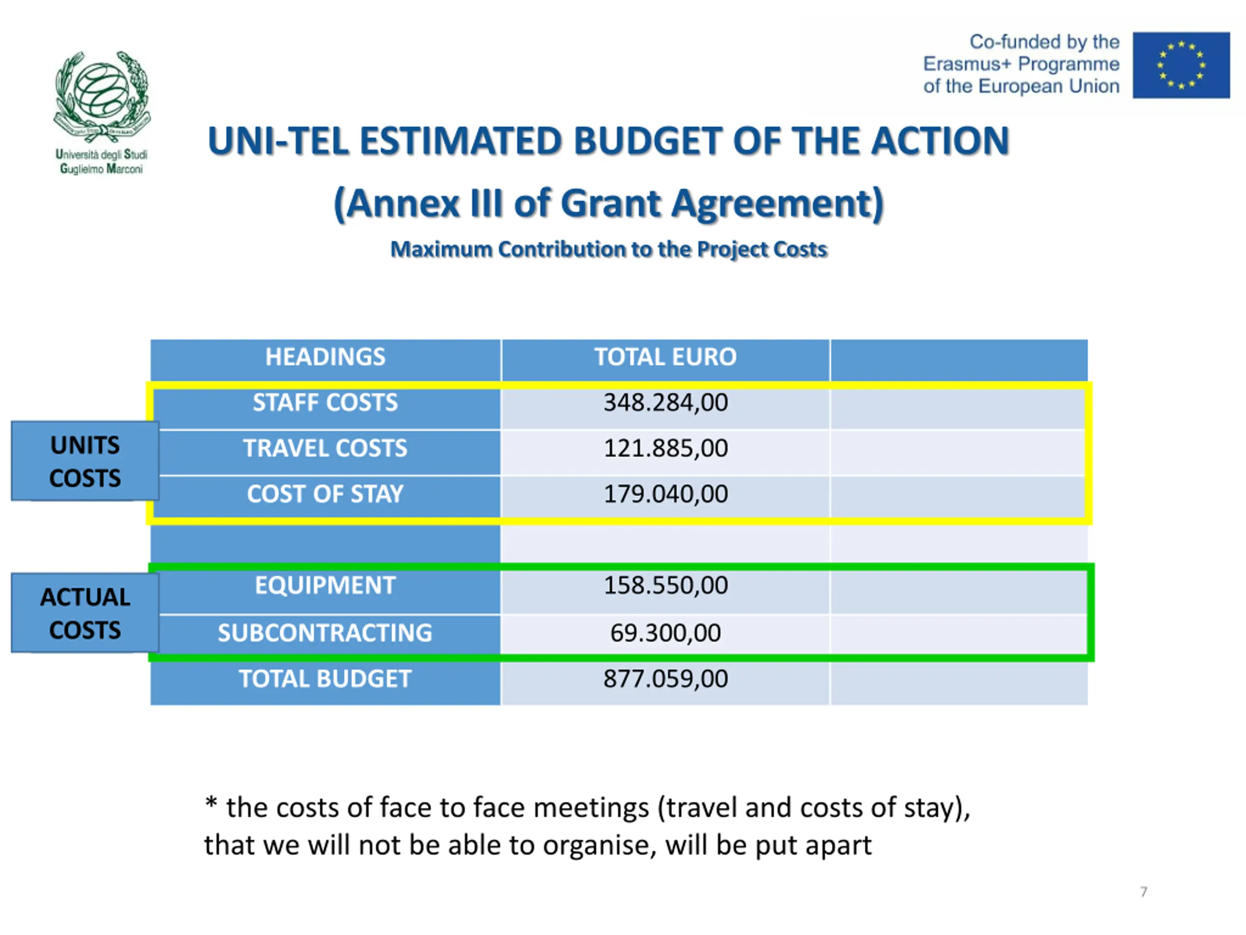UNI-TEL ESTIMATED BUDGET OF THE ACTION (Annex III of Grant Agreement) Maximum Contribution to the Project Costs HEADINGS TOTAL EURO STAFF COSTS 348.284,00 UNITS COSTS TRAVEL COSTS 121.885,00 COST OF STAY 179.040,00 EQUIPMENT 158.550,00 ACTUAL COSTS SUBCONTRACTING 69.300,00 TOTAL BUDGET 877.059,00 * the costs of face to face meetings (travel and costs of stay), that we will not be able to organise, will be put apart 7