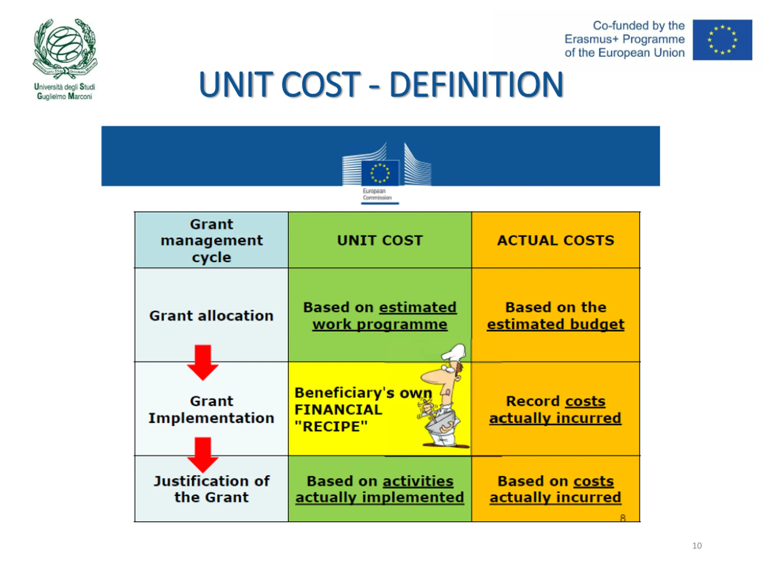 UNIT COST UNIT COST - - DEFINITION DEFINITION Fixed contribution multiplied by number of units, based on "Triggering events" (activities/outputs) No No need to justify level Need to proof proof the expenditure/workload/Travel level of spending Financial control/audit declared unit costs supported with proofs of activities proofs of activities implemented implemented Declared unit costs Declared unit costs ------ ------> proofs > proofs of activities implemented of activities implemented 9