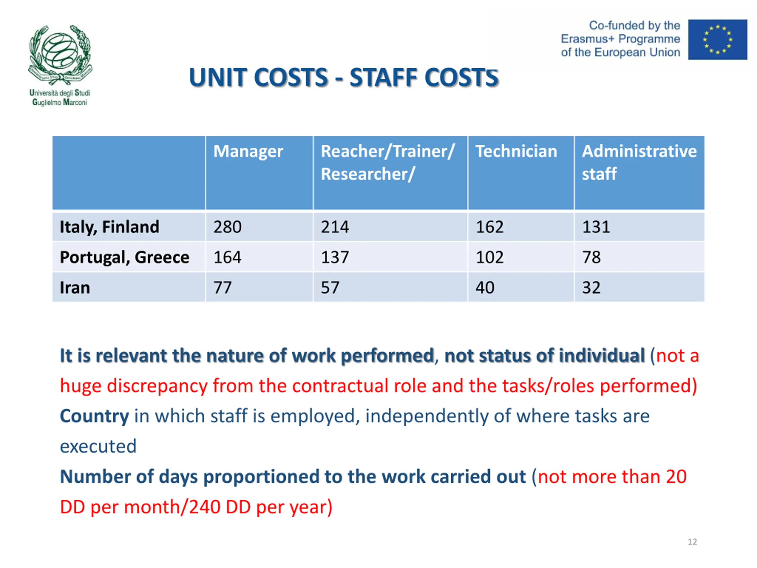 UNIT COSTS - STAFF COSTS Contribution to Institutions for Staff* performing tasks necessary to achieve the objectives of the project Unit cost = amount in Euro per working day per staff (not linked to the actual level of remuneration in the salary slip) Calculation 3 variables: staff category, country, number of days Categories: Managers, Researchers/Teachers/Trainers, Technical, Administrative *Formal contractual relationship with a beneficiary organisation 11