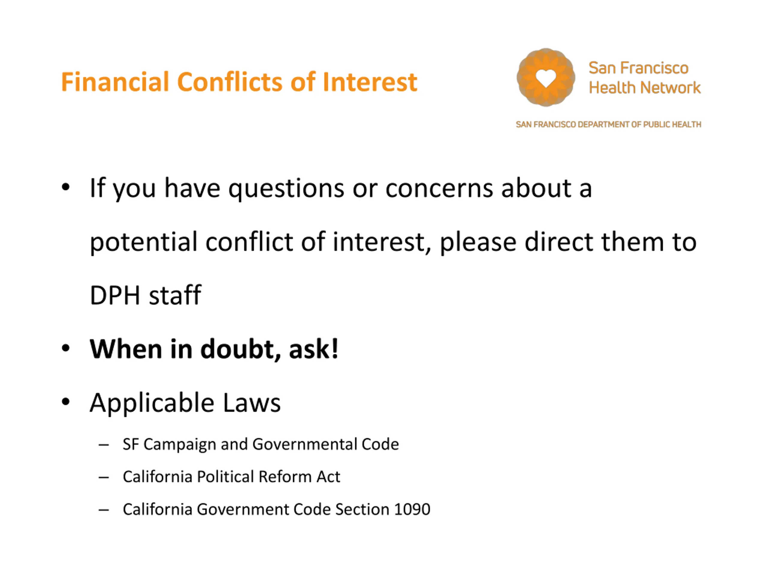 Financial Conflicts of Interest If you have questions or concerns about a potential conflict of interest, please direct them to DPH staff When in doubt, ask! Applicable Laws SF Campaign and Governmental Code California Political Reform Act California Government Code Section 1090