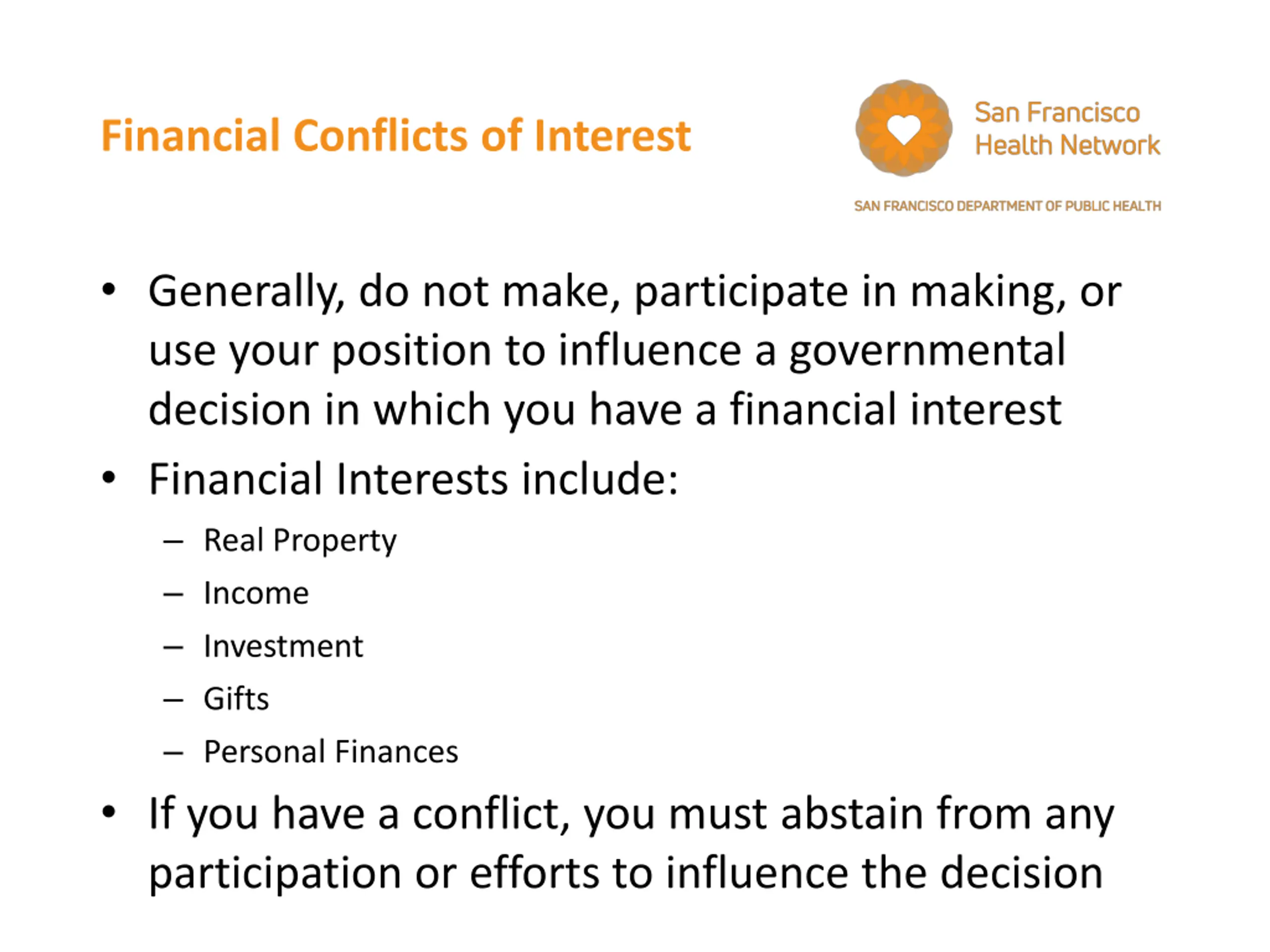 Financial Conflicts of Interest Generally, do not make, participate in making, or use your position to influence a governmental decision in which you have a financial interest Financial Interests include: Real Property Income Investment Gifts Personal Finances If you have a conflict, you must abstain from any participation or efforts to influence the decision
