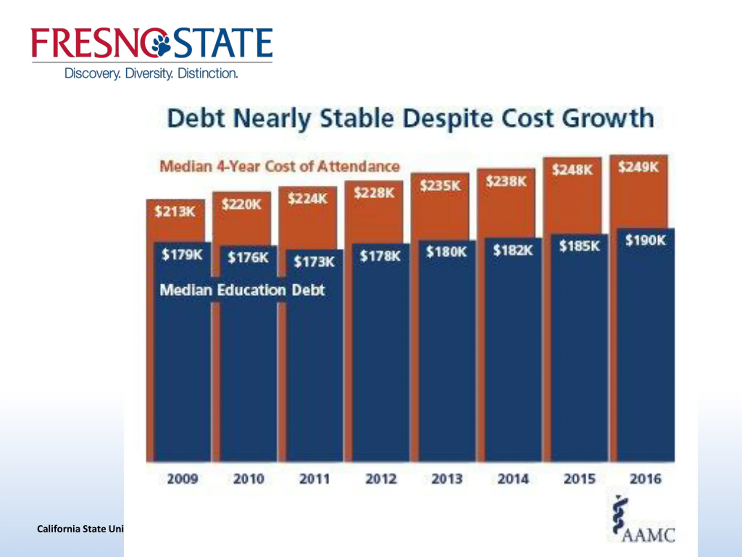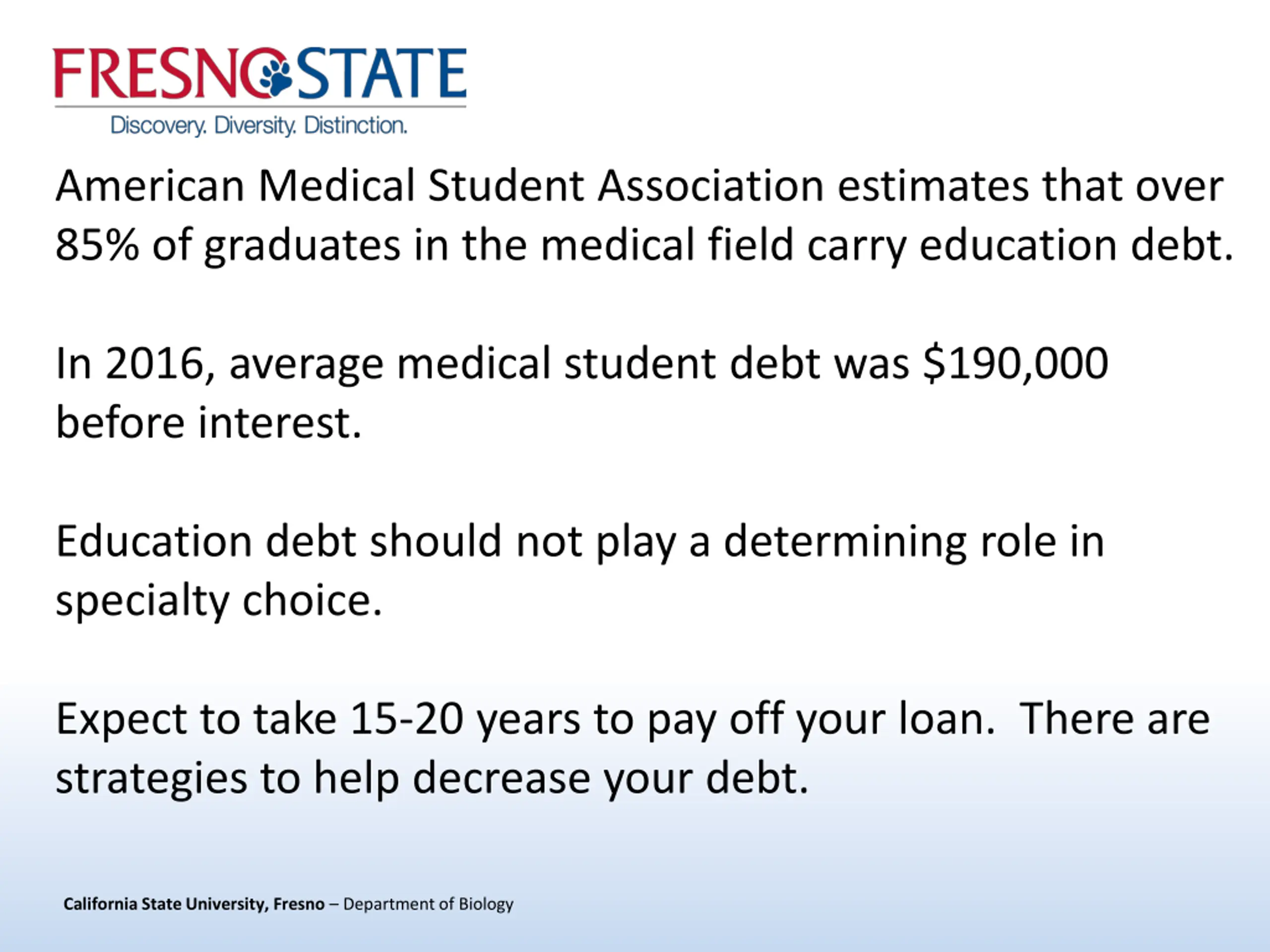 American Medical Student Association estimates that over 85% of graduates in the medical field carry education debt. In 2016, average medical student debt was $190,000 before interest. Education debt should not play a determining role in specialty choice. Expect to take 15-20 years to pay off your loan. There are strategies to help decrease your debt. California State University, Fresno Department of Biology