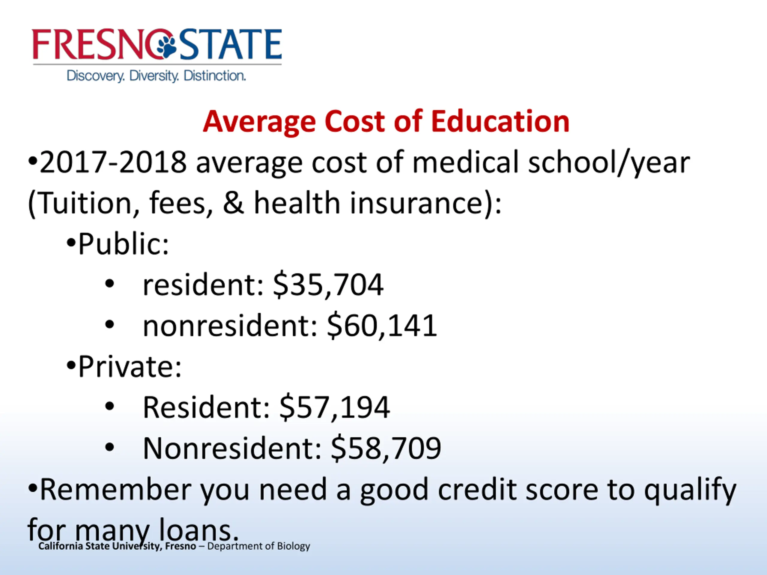 Average Cost of Education 2017-2018 average cost of medical school/year (Tuition, fees, & health insurance): Public: resident: $35,704 nonresident: $60,141 Private: Resident: $57,194 Nonresident: $58,709 Remember you need a good credit score to qualify California State University, Fresno Department of Biology for many loans.