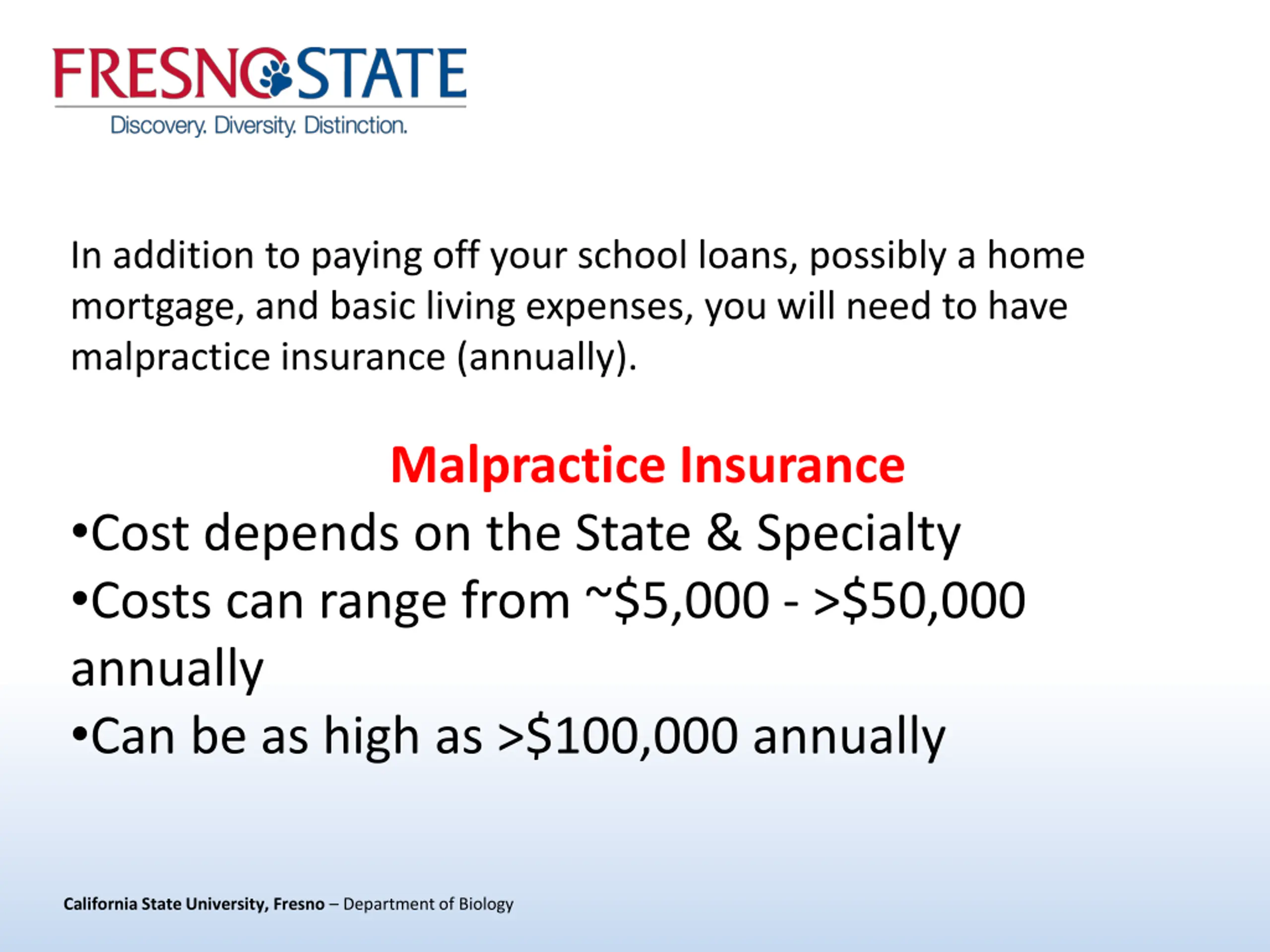 In addition to paying off your school loans, possibly a home mortgage, and basic living expenses, you will need to have malpractice insurance (annually). Malpractice Insurance Cost depends on the State & Specialty Costs can range from ~$5,000 - >$50,000 annually Can be as high as >$100,000 annually California State University, Fresno Department of Biology