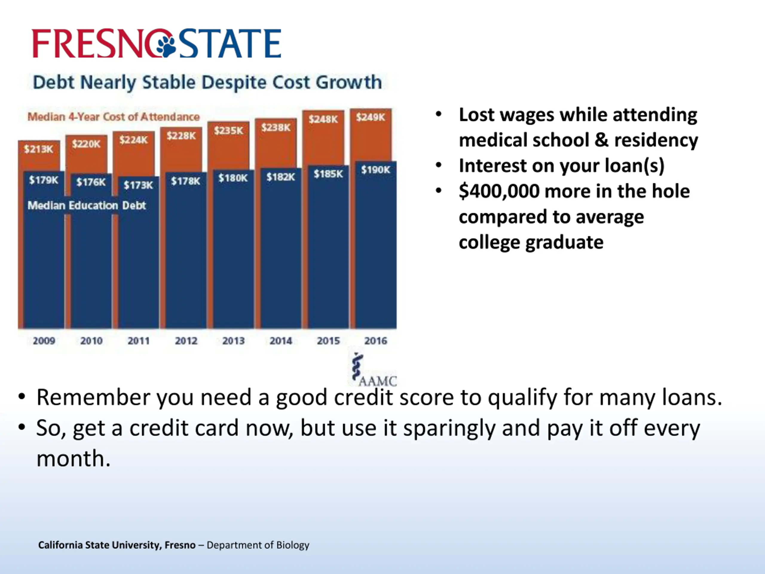 Lost wages while attending medical school & residency Interest on your loan(s) $400,000 more in the hole compared to average college graduate Remember you need a good credit score to qualify for many loans. So, get a credit card now, but use it sparingly and pay it off every month. California State University, Fresno Department of Biology