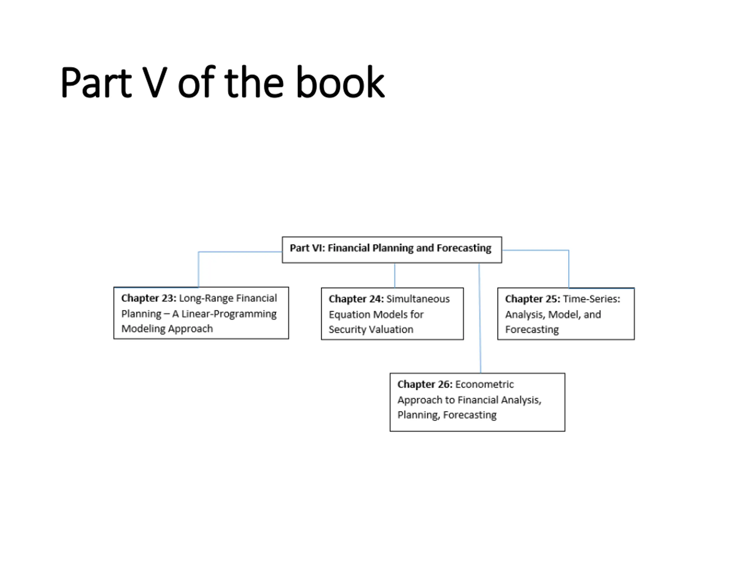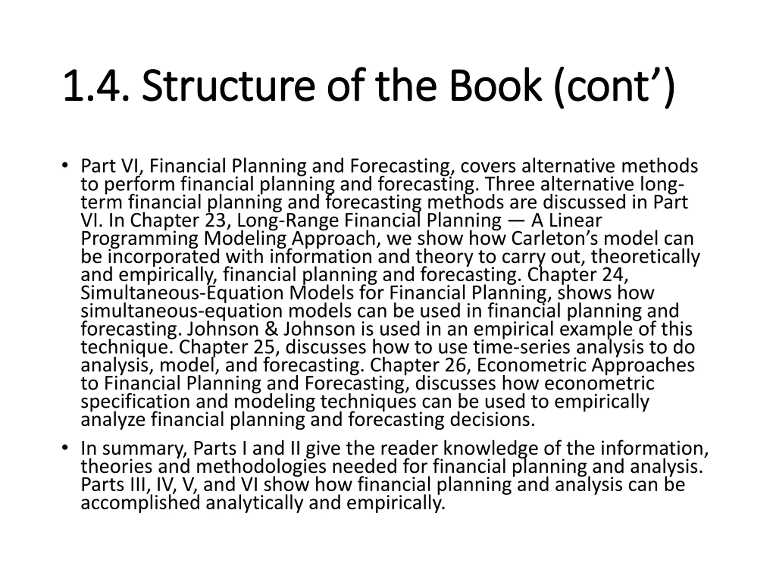 1.4. Structure of the Book ( 1.4. Structure of the Book (cont cont ) ) Part VI, Financial Planning and Forecasting, covers alternative methods to perform financial planning and forecasting. Three alternative long- term financial planning and forecasting methods are discussed in Part VI. In Chapter 23, Long-Range Financial Planning A Linear Programming Modeling Approach, we show how Carleton s model can be incorporated with information and theory to carry out, theoretically and empirically, financial planning and forecasting. Chapter 24, Simultaneous-Equation Models for Financial Planning, shows how simultaneous-equation models can be used in financial planning and forecasting. Johnson & Johnson is used in an empirical example of this technique. Chapter 25, discusses how to use time-series analysis to do analysis, model, and forecasting. Chapter 26, Econometric Approaches to Financial Planning and Forecasting, discusses how econometric specification and modeling techniques can be used to empirically analyze financial planning and forecasting decisions. In summary, Parts I and II give the reader knowledge of the information, theories and methodologies needed for financial planning and analysis. Parts III, IV, V, and VI show how financial planning and analysis can be accomplished analytically and empirically.