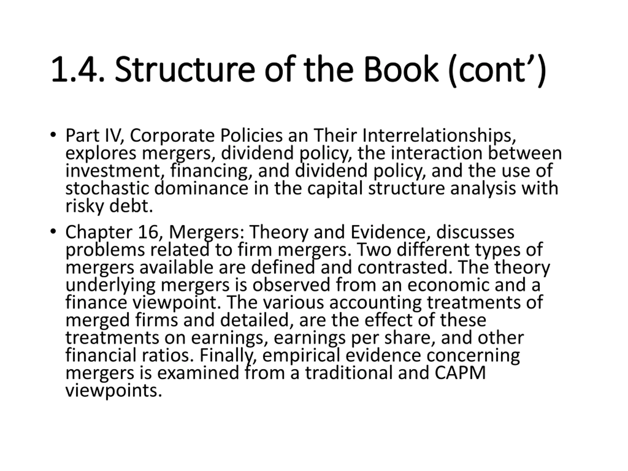 1.4. Structure of the Book ( 1.4. Structure of the Book (cont cont ) ) Part IV, Corporate Policies an Their Interrelationships, explores mergers, dividend policy, the interaction between investment, financing, and dividend policy, and the use of stochastic dominance in the capital structure analysis with risky debt. Chapter 16, Mergers: Theory and Evidence, discusses problems related to firm mergers. Two different types of mergers available are defined and contrasted. The theory underlying mergers is observed from an economic and a finance viewpoint. The various accounting treatments of merged firms and detailed, are the effect of these treatments on earnings, earnings per share, and other financial ratios. Finally, empirical evidence concerning mergers is examined from a traditional and CAPM viewpoints.