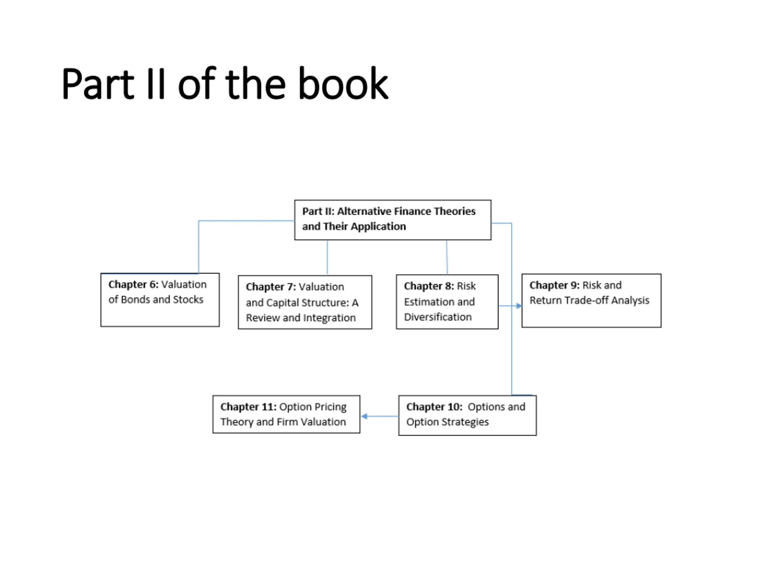 1.4. Structure of the Book ( 1.4. Structure of the Book (cont cont ) ) Part II, Alternative Finance Theories and the Cost of Capital, discusses how finance theory can make financial planning and analysis more general and useful. Classical theory, the new classical theory, capital asset pricing theory, and option-pricing theory are the four theoretical bases used here. These four theories are interrelated, and therefore are presented together. Chapter 6, Valuation of Bonds and Stocks, discusses the basic concepts and methods to evaluate stocks and bonds. Furthermore, the chapter explains risk, return, and market efficiency and exchange rates and investing overseas. The chapter ends with the Appendix, which addresses the relationship between exchange rates and interest rates.