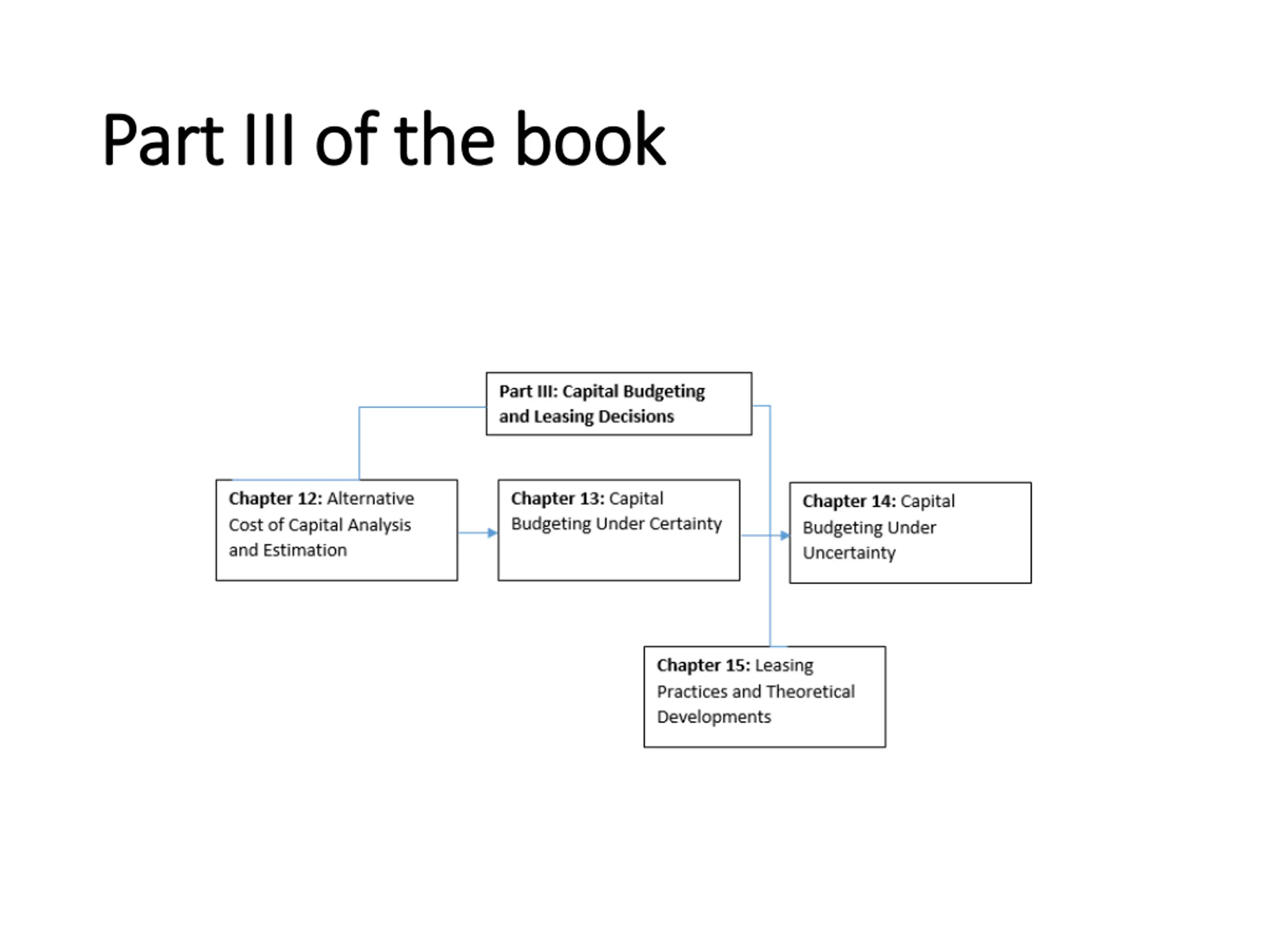 1.4. Structure of the Book ( 1.4. Structure of the Book (cont cont ) ) Part III, Capital Budgeting and Leasing Decisions, shows the use of the cost of capital and cash flow information in capital budgeting and leasing decisions. Chapter 12, Alternative Cost of Capital Analysis and Estimation, shows the empirical uses of four theories in the determination of the cost of capital. Chapter 13, Capital Budgeting under Certainty, and Chapter 14, Capital Budgeting under Uncertainty, introduce a major area of financial decision making, that of capital budgeting. In these two chapters, information, theory, and methodologies from Parts I and II are used in making investment decisions. A linear programming technique is introduced in Chapter 10 in performing capital rationing analysis. Issues related to multiperiod capital budgeting and the impact of inflation are also discussed.