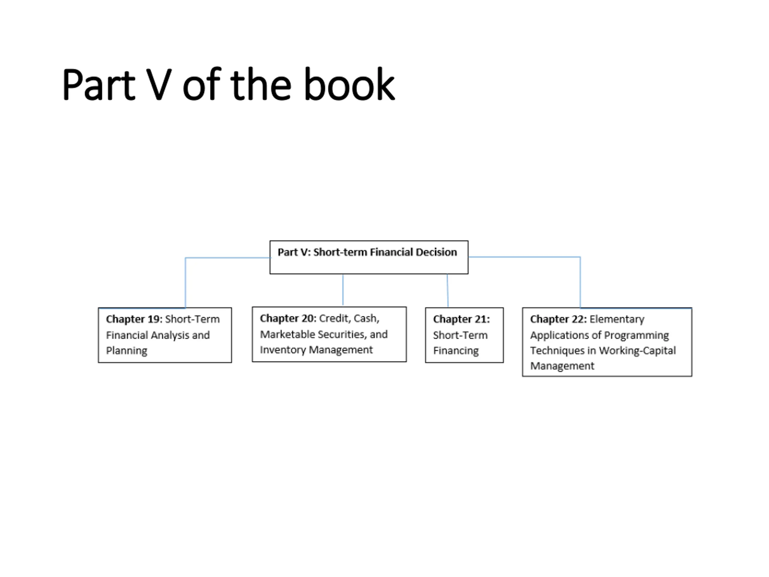 1.4. Structure of the Book ( 1.4. Structure of the Book (cont cont ) ) Part V discusses the issue of Short-term Financial Decision. Chapter 19 discusses short-term financial analysis and planning. Chapter 20 discusses credit, cash, marketable securities, and inventory management. Chapter 21, discusses short term financing. Finally, Chapter 22 discusses Elementary Applications of Programming Techniques inWorking- CapitalManagement, introduces the use of linear and goal programming in working-capital management. Part VI, Financial Planning and Forecasting, covers alternative methods to perform financial planning and forecasting.