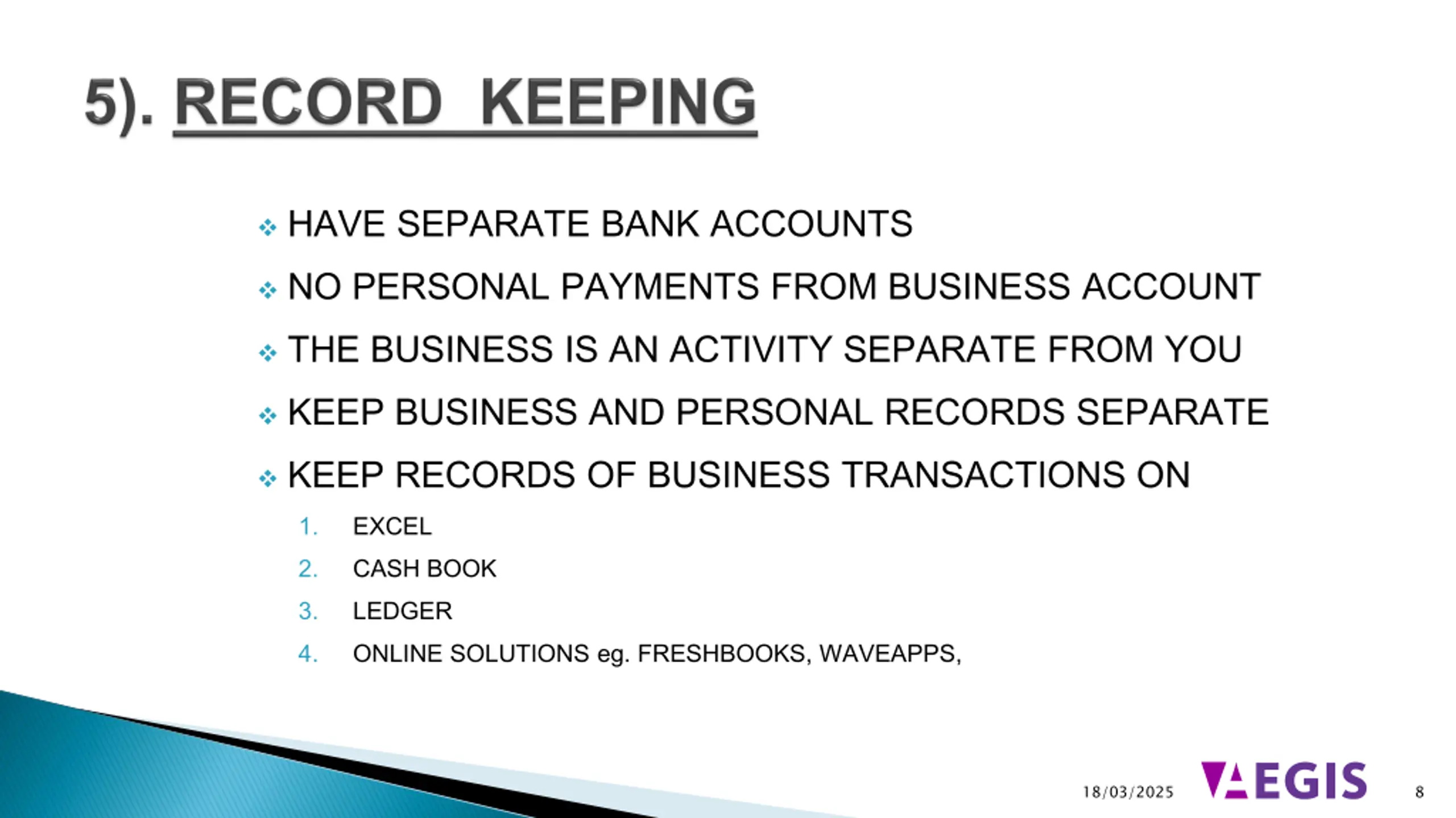 HAVE SEPARATE BANK ACCOUNTS NO PERSONAL PAYMENTS FROM BUSINESS ACCOUNT THE BUSINESS IS AN ACTIVITY SEPARATE FROM YOU KEEP BUSINESS AND PERSONAL RECORDS SEPARATE KEEP RECORDS OF BUSINESS TRANSACTIONS ON 1. EXCEL 2. CASH BOOK 3. LEDGER 4. ONLINE SOLUTIONS eg. FRESHBOOKS, WAVEAPPS, 8 18/03/2025