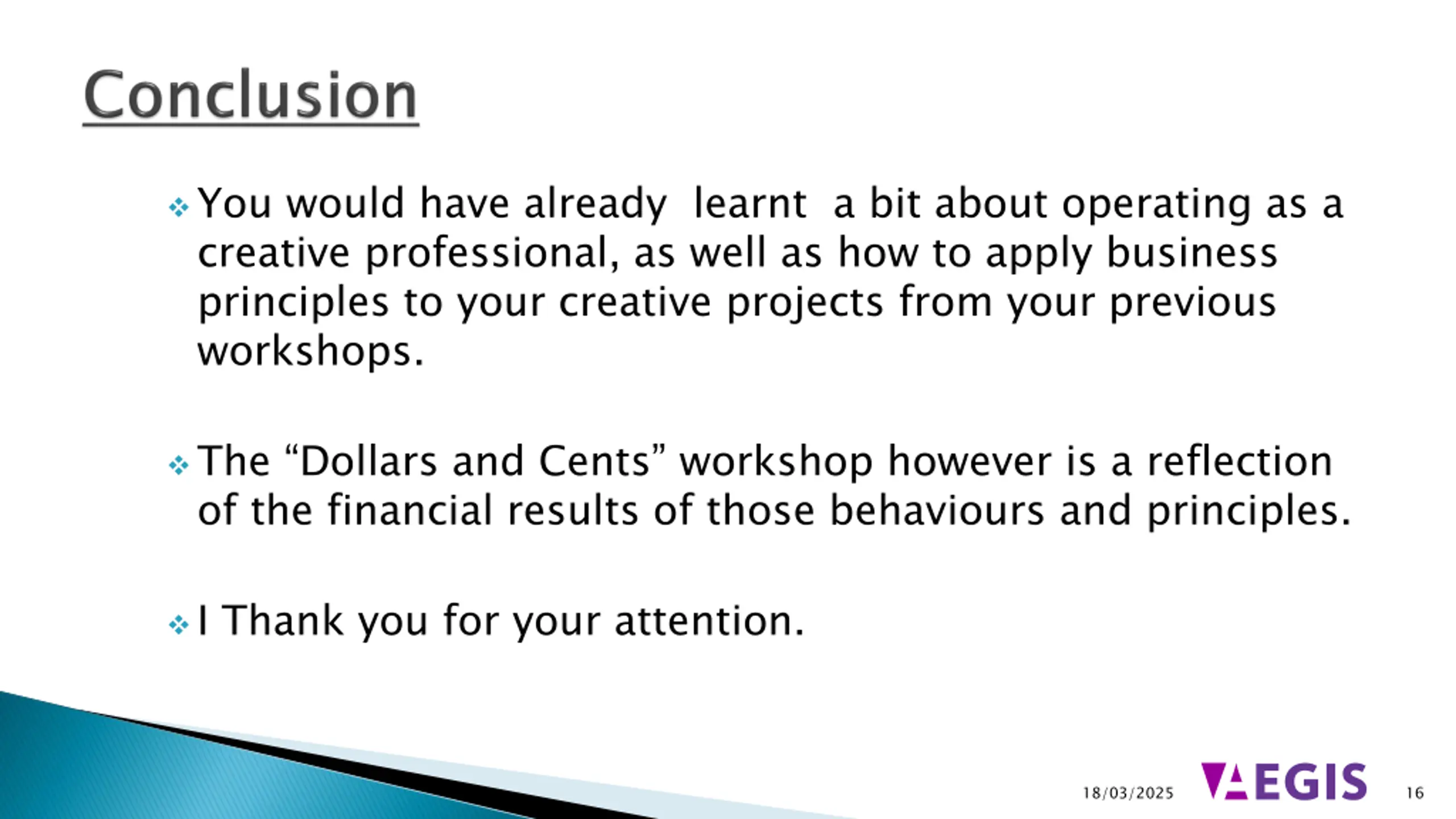 You would have already learnt a bit about operating as a creative professional, as well as how to apply business principles to your creative projects from your previous workshops. The Dollars and Cents workshop however is a reflection of the financial results of those behaviours and principles. I Thank you for your attention. 16 18/03/2025