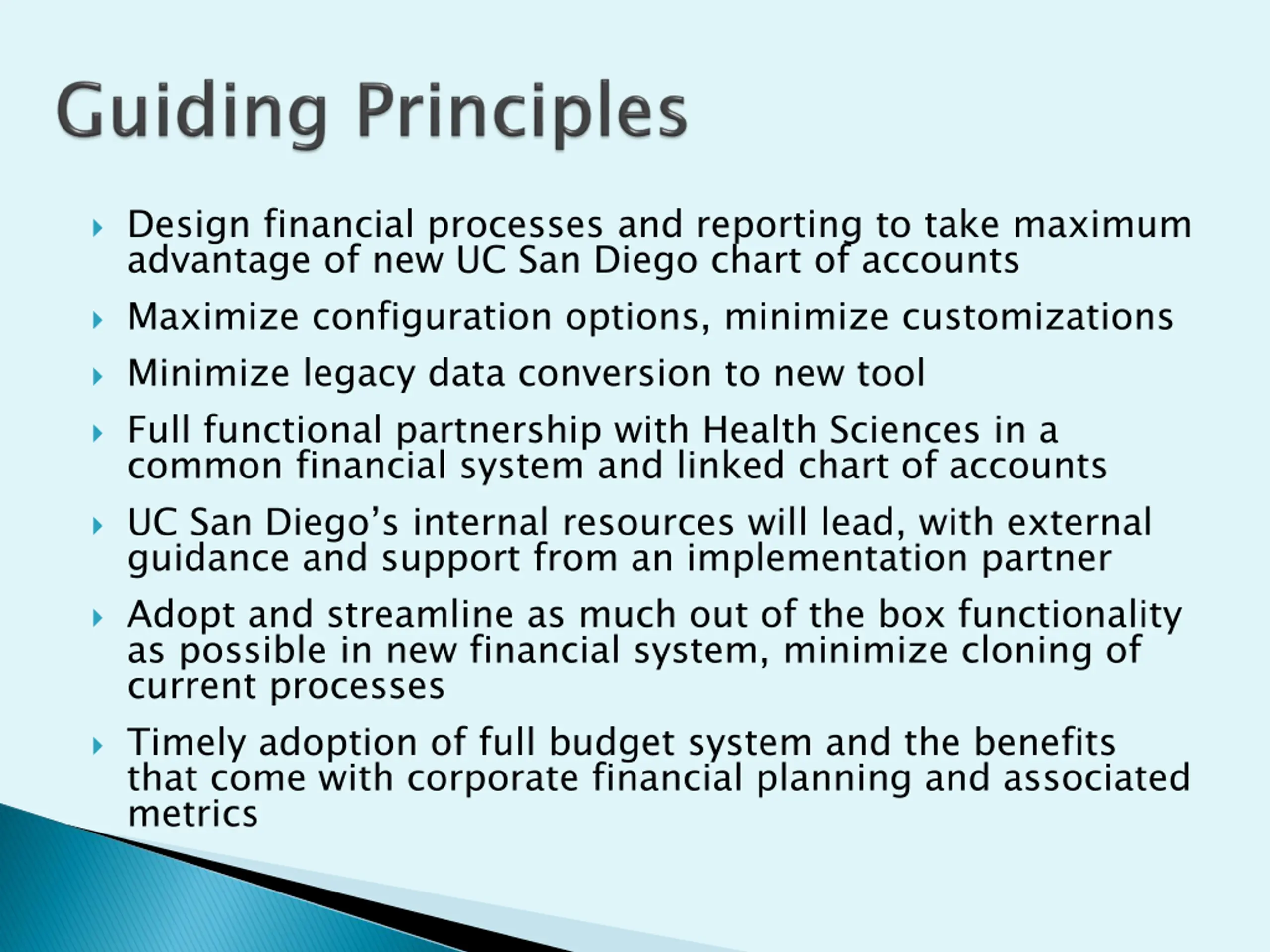 Design financial processes and reporting to take maximum advantage of new UC San Diego chart of accounts Maximize configuration options, minimize customizations Minimize legacy data conversion to new tool Full functional partnership with Health Sciences in a common financial system and linked chart of accounts UC San Diego s internal resources will lead, with external guidance and support from an implementation partner Adopt and streamline as much out of the box functionality as possible in new financial system, minimize cloning of current processes Timely adoption of full budget system and the benefits that come with corporate financial planning and associated metrics