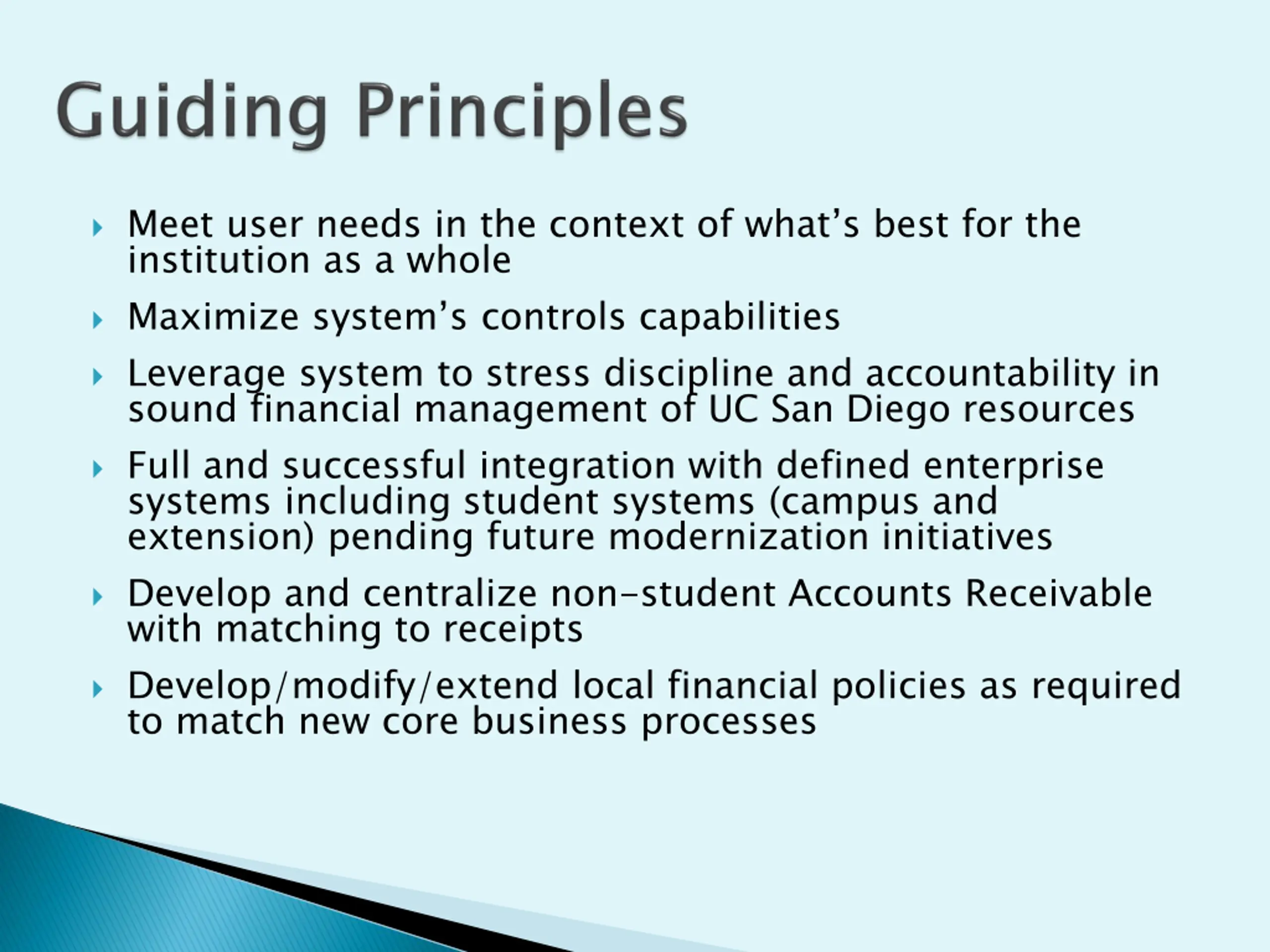 Meet user needs in the context of whats best for the institution as a whole Maximize system s controls capabilities Leverage system to stress discipline and accountability in sound financial management of UC San Diego resources Full and successful integration with defined enterprise systems including student systems (campus and extension) pending future modernization initiatives Develop and centralize non-student Accounts Receivable with matching to receipts Develop/modify/extend local financial policies as required to match new core business processes