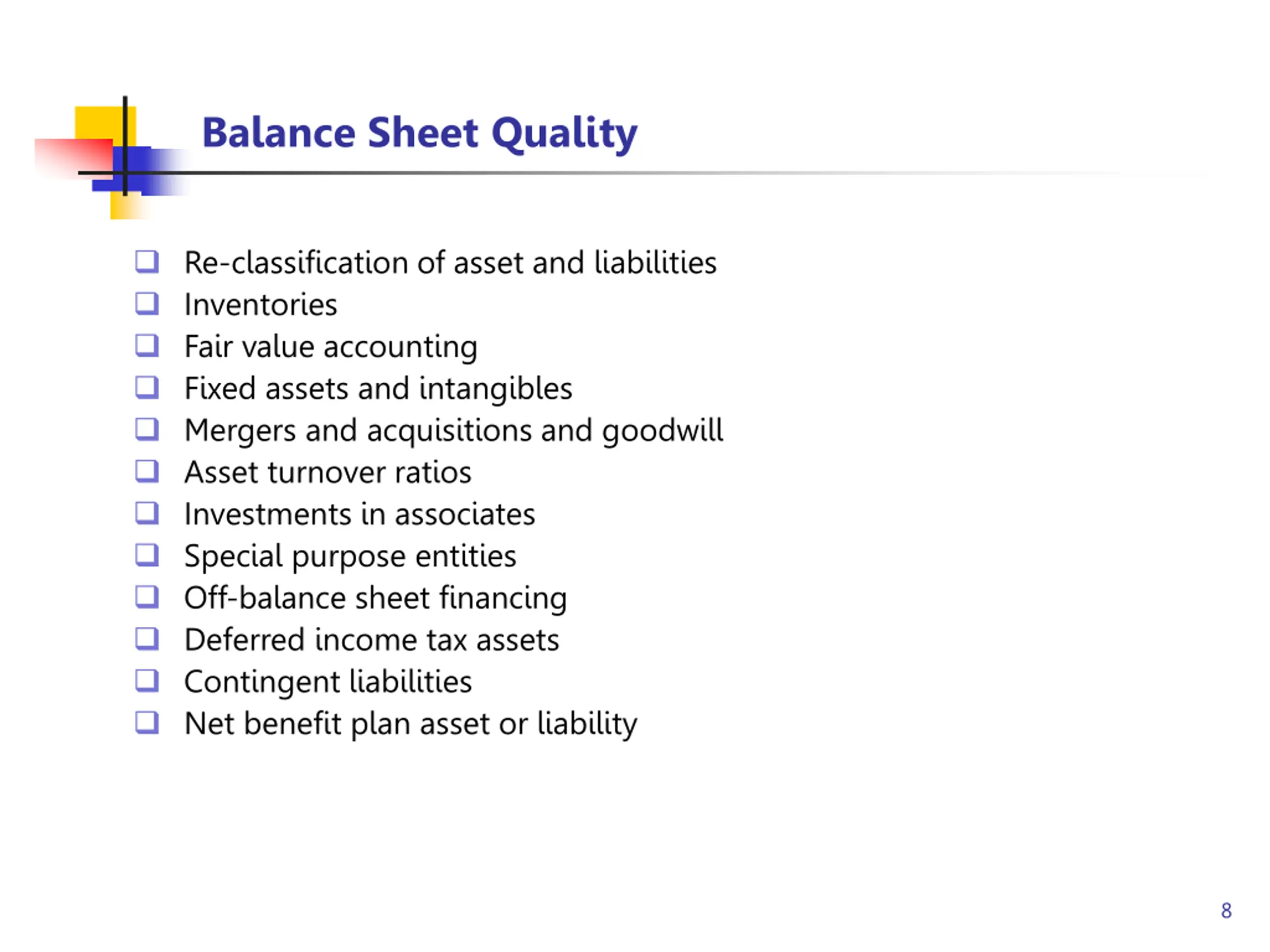 Balance Sheet Quality Re-classification of asset and liabilities Inventories Fair value accounting Fixed assets and intangibles Mergers and acquisitions and goodwill Asset turnover ratios Investments in associates Special purpose entities Off-balance sheet financing Deferred income tax assets Contingent liabilities Net benefit plan asset or liability 8