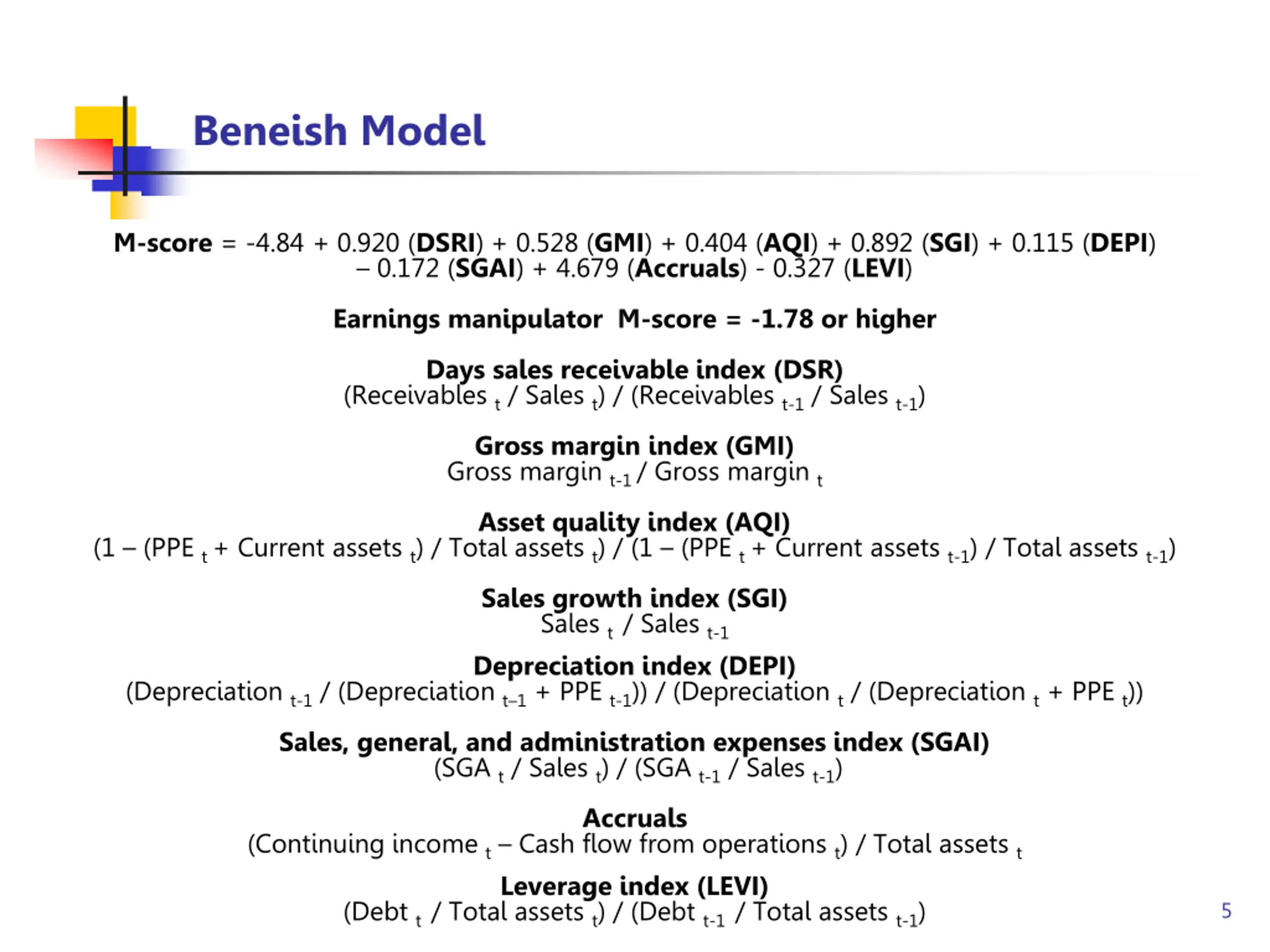 Beneish Model M-score = -4.84 + 0.920 (DSRI) + 0.528 (GMI) + 0.404 (AQI) + 0.892 (SGI) + 0.115 (DEPI) 0.172 (SGAI) + 4.679 (Accruals) - 0.327 (LEVI) Earnings manipulator M-score = -1.78 or higher Days sales receivable index (DSR) (Receivables t / Sales t) / (Receivables t-1 / Sales t-1) Gross margin index (GMI) Gross margin t-1 / Gross margin t Asset quality index (AQI) (1 (PPE t + Current assets t) / Total assets t) / (1 (PPE t + Current assets t-1) / Total assets t-1) Sales growth index (SGI) Sales t / Sales t-1 Depreciation index (DEPI) (Depreciation t-1 / (Depreciation t 1 + PPE t-1)) / (Depreciation t / (Depreciation t + PPE t)) Sales, general, and administration expenses index (SGAI) (SGA t / Sales t) / (SGA t-1 / Sales t-1) Accruals (Continuing income t Cash flow from operations t) / Total assets t Leverage index (LEVI) (Debt t / Total assets t) / (Debt t-1 / Total assets t-1) 5