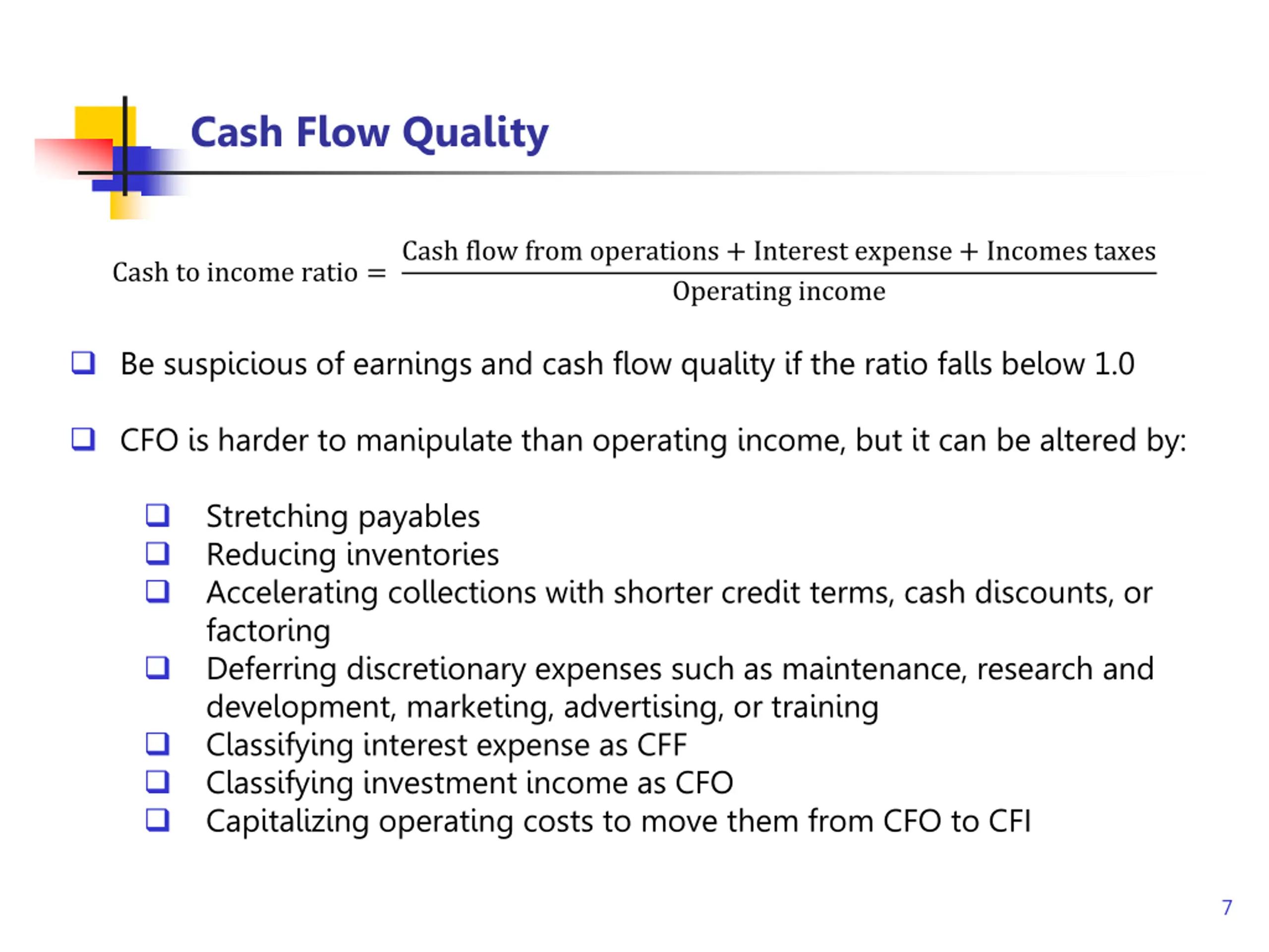 Cash Flow Quality Cash flow from operations + Interest expense + Incomes taxes Operating income Cash to income ratio = Be suspicious of earnings and cash flow quality if the ratio falls below 1.0 CFO is harder to manipulate than operating income, but it can be altered by: Stretching payables Reducing inventories Accelerating collections with shorter credit terms, cash discounts, or factoring Deferring discretionary expenses such as maintenance, research and development, marketing, advertising, or training Classifying interest expense as CFF Classifying investment income as CFO Capitalizing operating costs to move them from CFO to CFI 7