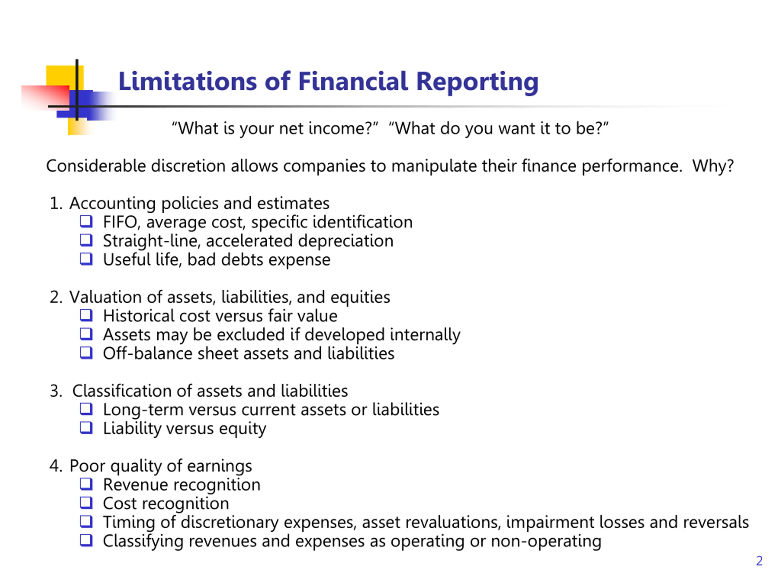 Limitations of Financial Reporting What is your net income? What do you want it to be? Considerable discretion allows companies to manipulate their finance performance. Why? 1. Accounting policies and estimates FIFO, average cost, specific identification Straight-line, accelerated depreciation Useful life, bad debts expense 2. Valuation of assets, liabilities, and equities Historical cost versus fair value Assets may be excluded if developed internally Off-balance sheet assets and liabilities 3. Classification of assets and liabilities Long-term versus current assets or liabilities Liability versus equity 4. Poor quality of earnings Revenue recognition Cost recognition Timing of discretionary expenses, asset revaluations, impairment losses and reversals Classifying revenues and expenses as operating or non-operating 2