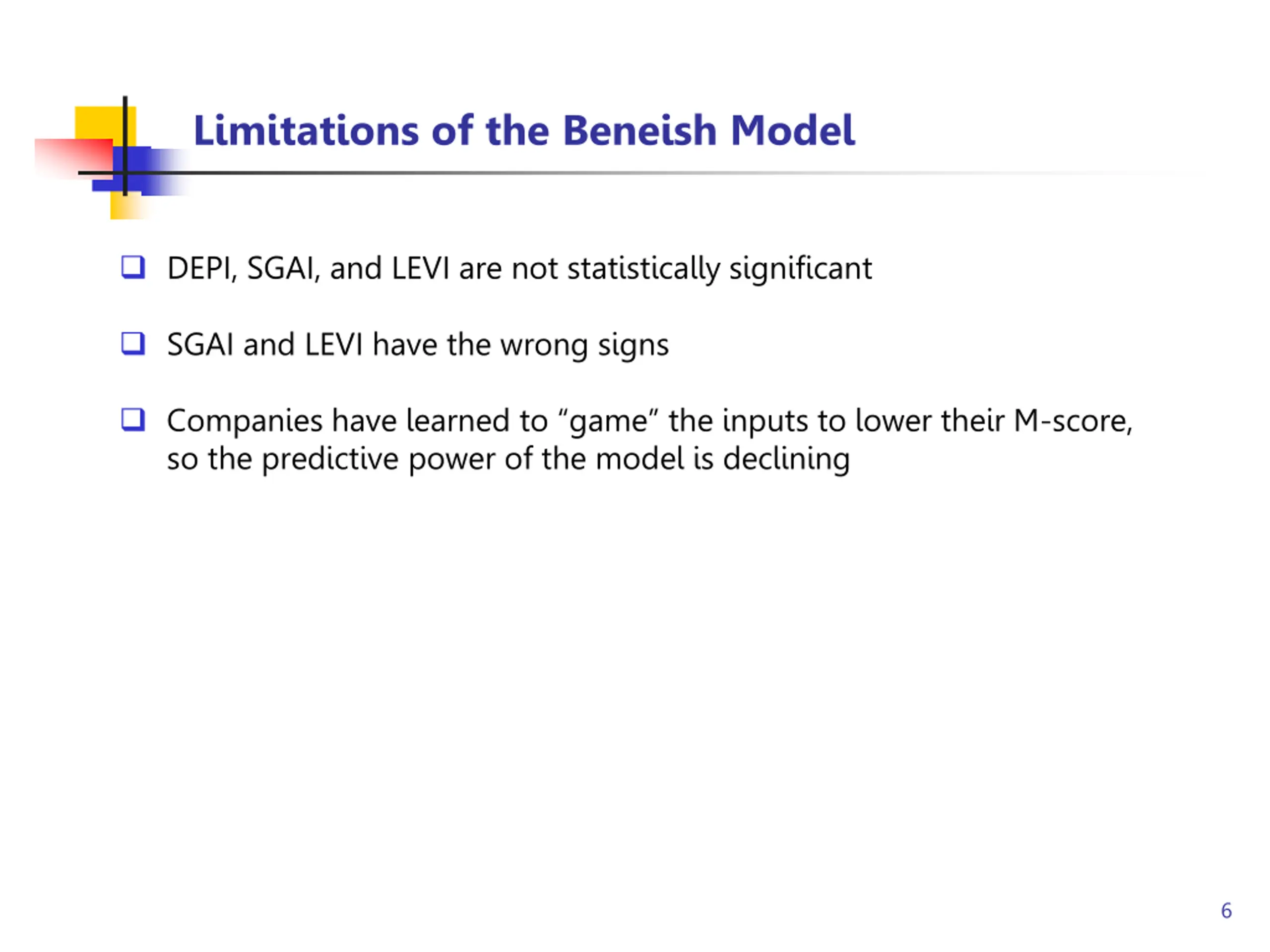 Limitations of the Beneish Model DEPI, SGAI, and LEVI are not statistically significant SGAI and LEVI have the wrong signs Companies have learned to game the inputs to lower their M-score, so the predictive power of the model is declining 6