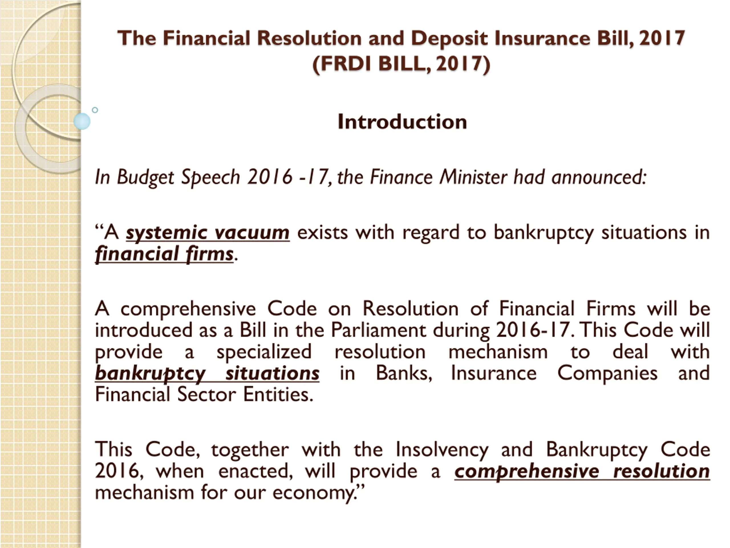 The Financial Resolution and Deposit Insurance Bill, 2017 (FRDI BILL, 2017) Introduction In Budget Speech 2016 -17,the Finance Minister had announced: A systemic vacuum exists with regard to bankruptcy situations in financial firms. A comprehensive Code on Resolution of Financial Firms will be introduced as a Bill in the Parliament during 2016-17.This Code will provide a specialized resolution bankruptcy situations in Banks, Insurance Financial Sector Entities. mechanism to deal with and Companies This Code, together with the Insolvency and Bankruptcy Code 2016, when enacted, will provide a comprehensive resolution mechanism for our economy.