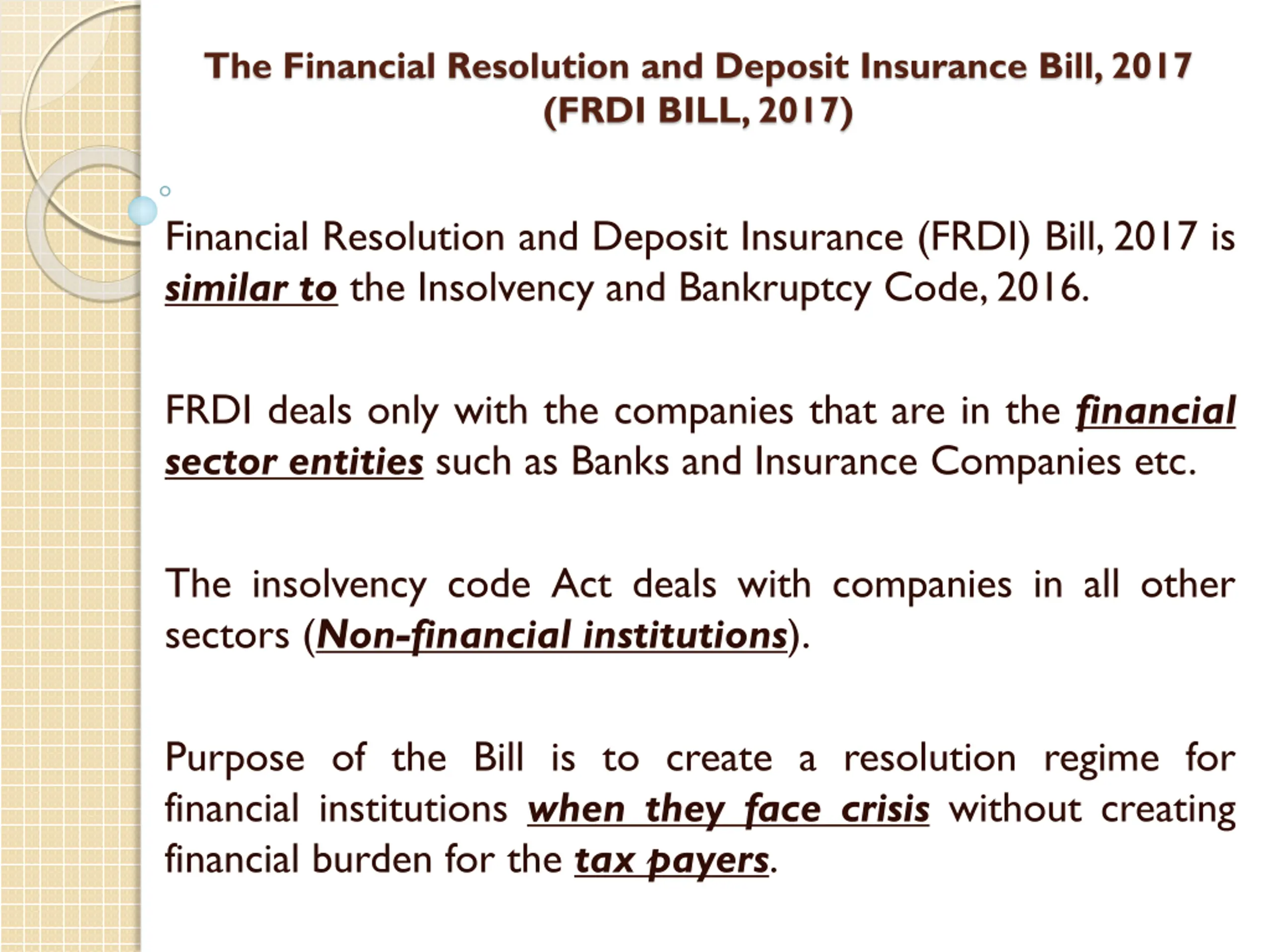 The Financial Resolution and Deposit Insurance Bill, 2017 (FRDI BILL, 2017) Financial Resolution and Deposit Insurance (FRDI) Bill,2017 is similar to the Insolvency and Bankruptcy Code,2016. FRDI deals only with the companies that are in the financial sector entities such as Banks and Insurance Companies etc. The insolvency code Act deals with companies in all other sectors (Non-financial institutions). Purpose of the Bill is to create a resolution regime for financial institutions when they face crisis without creating financial burden for the tax payers.