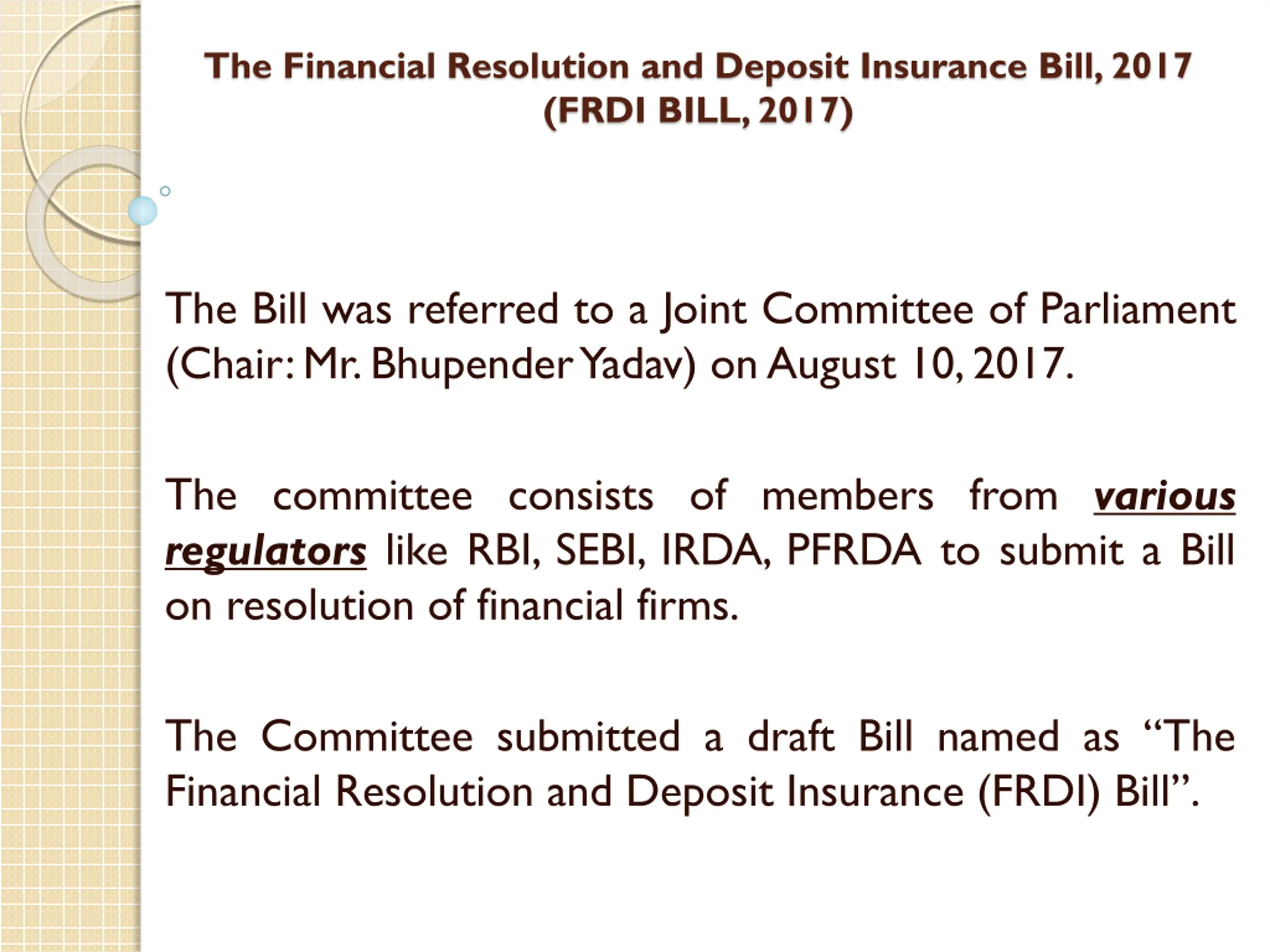 The Financial Resolution and Deposit Insurance Bill, 2017 (FRDI BILL, 2017) The Bill was referred to a Joint Committee of Parliament (Chair:Mr.BhupenderYadav) onAugust 10,2017. The committee consists of members from various regulators like RBI, SEBI, IRDA, PFRDA to submit a Bill on resolution of financial firms. The Committee submitted a draft Bill named as The Financial Resolution and Deposit Insurance (FRDI) Bill .