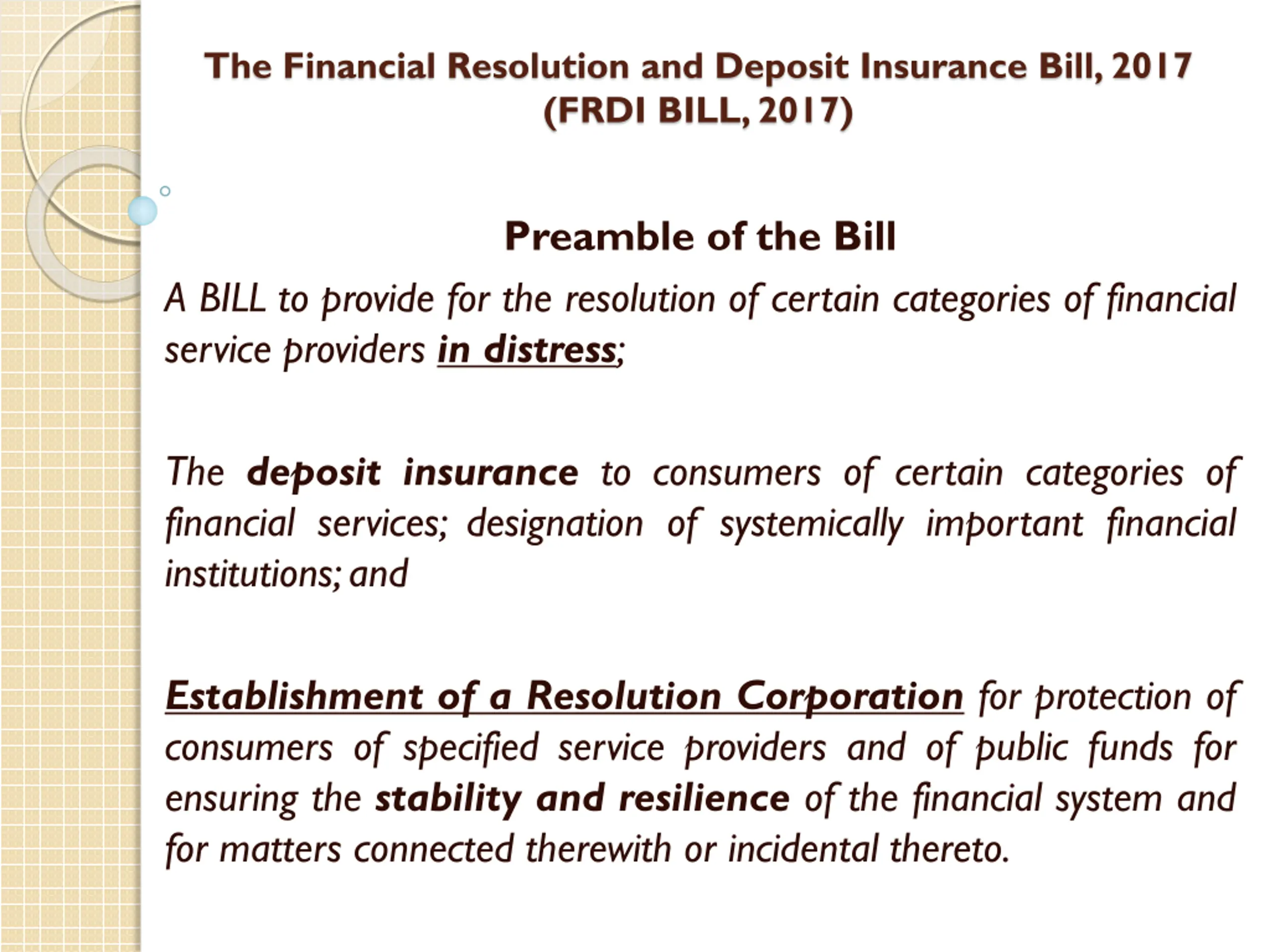 The Financial Resolution and Deposit Insurance Bill, 2017 (FRDI BILL, 2017) Preamble of the Bill A BILL to provide for the resolution of certain categories of financial service providers in distress; The deposit insurance to consumers of certain categories of financial services; designation of systemically important financial institutions;and Establishment of a Resolution Corporation for protection of consumers of specified service providers and of public funds for ensuring the stability and resilience of the financial system and for matters connected therewith or incidental thereto.