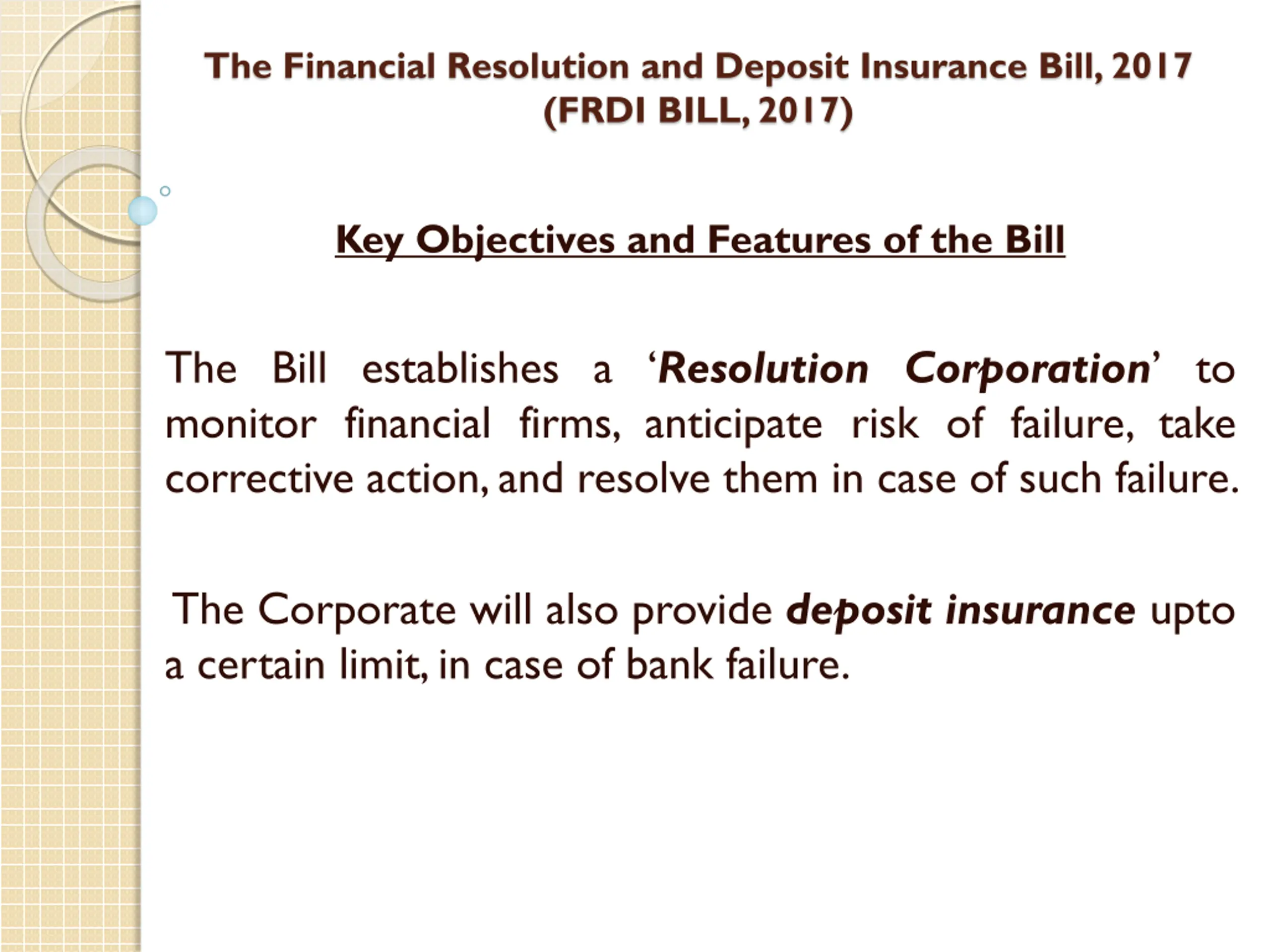 The Financial Resolution and Deposit Insurance Bill, 2017 (FRDI BILL, 2017) Key Objectives and Features of the Bill The Bill establishes a Resolution Corporation to monitor financial firms, anticipate risk of failure, take corrective action,and resolve them in case of such failure. The Corporate will also provide deposit insurance upto a certain limit,in case of bank failure.