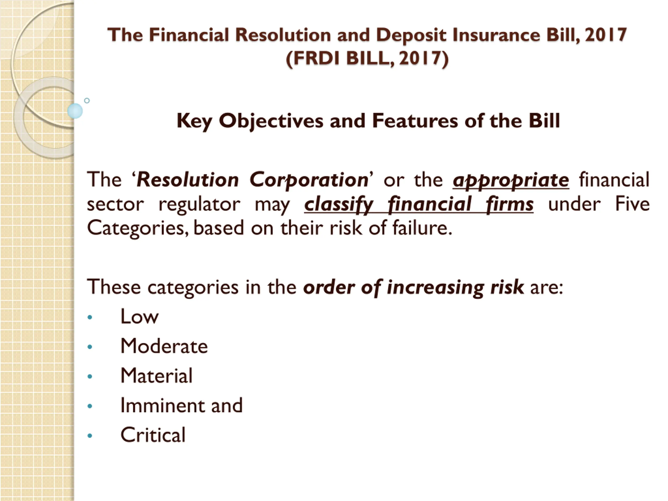 The Financial Resolution and Deposit Insurance Bill, 2017 (FRDI BILL, 2017) Key Objectives and Features of the Bill The Resolution Corporation or the appropriate financial sector regulator may classify financial firms under Five Categories,based on their risk of failure. These categories in the order of increasing risk are: Low Moderate Material Imminent and Critical