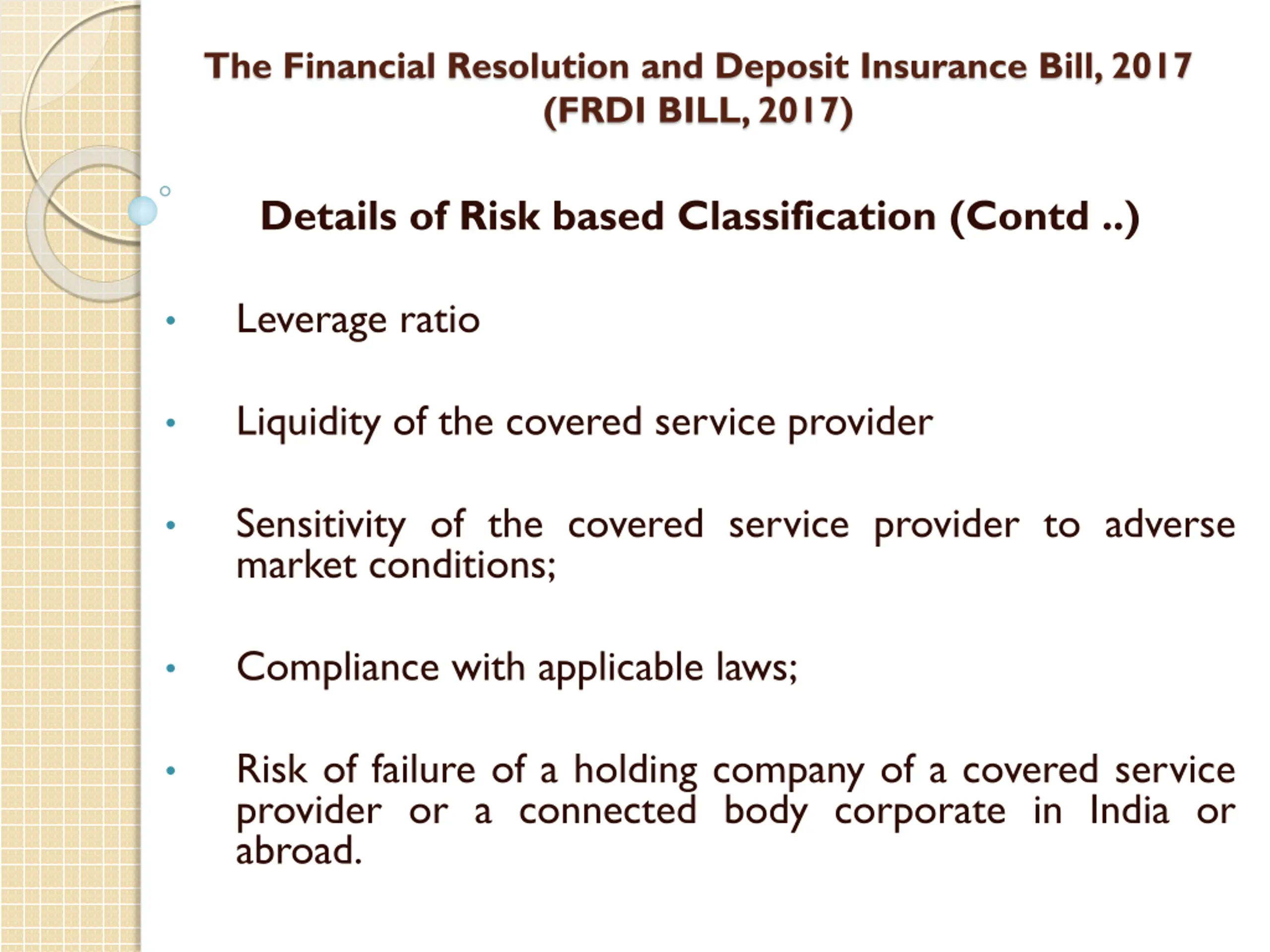 The Financial Resolution and Deposit Insurance Bill, 2017 (FRDI BILL, 2017) Details of Risk based Classification (Contd ..) Leverage ratio Liquidity of the covered service provider Sensitivity of the covered service provider to adverse market conditions; Compliance with applicable laws; Risk of failure of a holding company of a covered service provider or a connected body corporate in India or abroad.