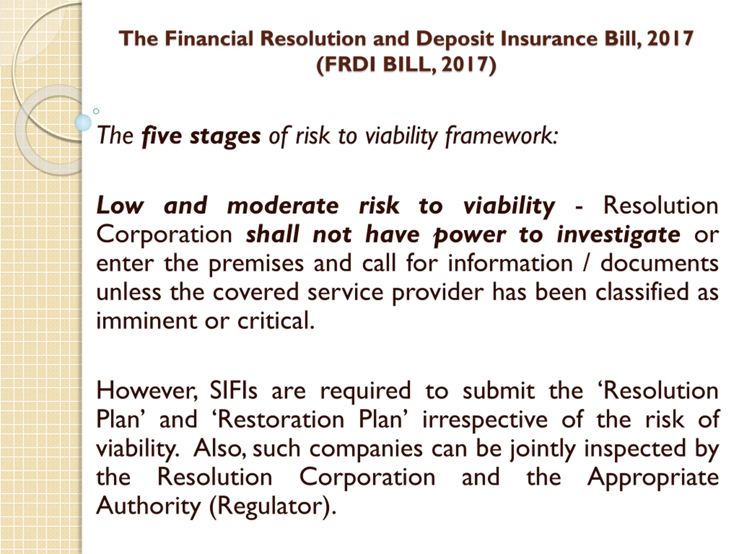 The Financial Resolution and Deposit Insurance Bill, 2017 (FRDI BILL, 2017) The five stages of risk to viability framework: Low and moderate risk to viability - Resolution Corporation shall not have power to investigate or enter the premises and call for information / documents unless the covered service provider has been classified as imminent or critical. However, SIFIs are required to submit the Resolution Plan and Restoration Plan irrespective of the risk of viability. Also,such companies can be jointly inspected by the Resolution Corporation Authority (Regulator). and the Appropriate