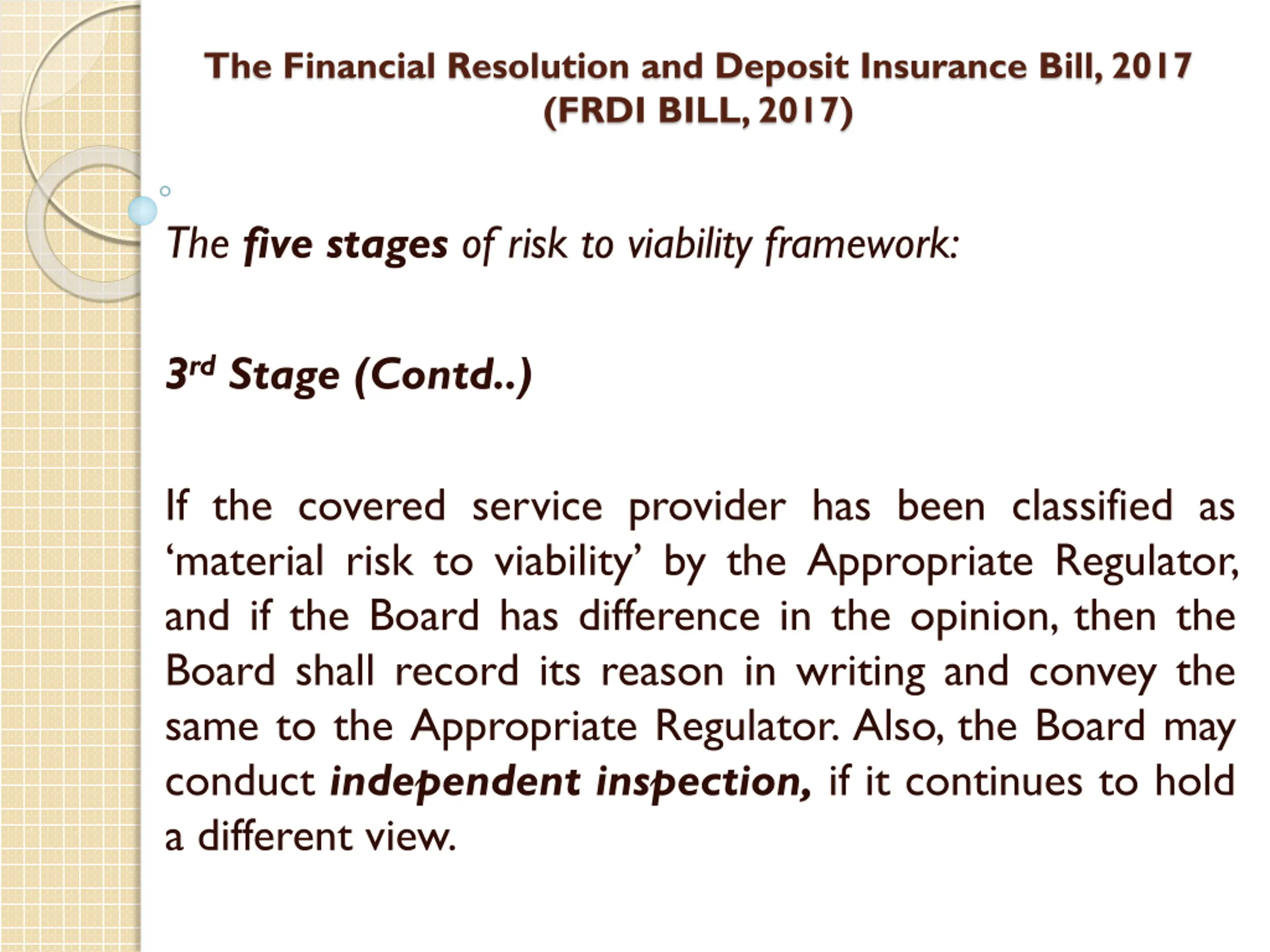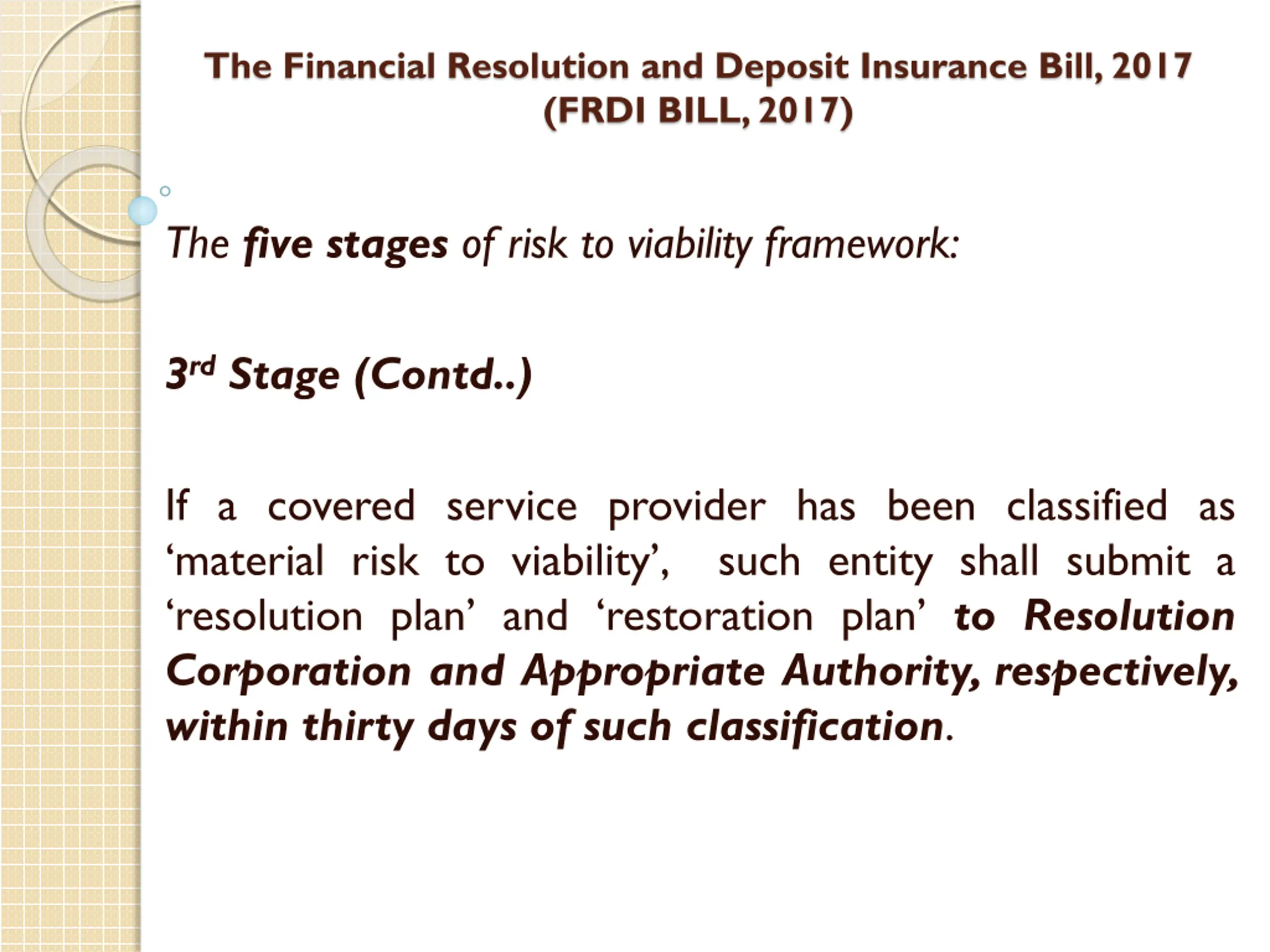 The Financial Resolution and Deposit Insurance Bill, 2017 (FRDI BILL, 2017) The five stages of risk to viability framework: 3rdStage Material risk to viability - The probability of failure of a covered service provider is marginally above acceptable probability of failure.