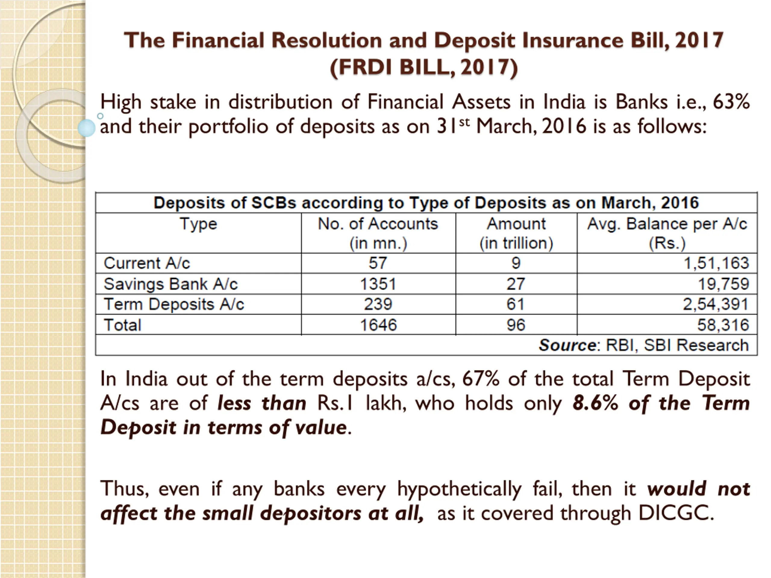 The Financial Resolution and Deposit Insurance Bill, 2017 (FRDI BILL, 2017) High stake in distribution of Financial Assets in India is Banks i.e., 63% and their portfolio of deposits as on 31stMarch,2016 is as follows: In India out of the term deposits a/cs, 67% of the total Term Deposit A/cs are of less than Rs.1 lakh, who holds only 8.6% of the Term Deposit in terms of value. Thus, even if any banks every hypothetically fail, then it would not affect the small depositors at all, as it covered through DICGC.