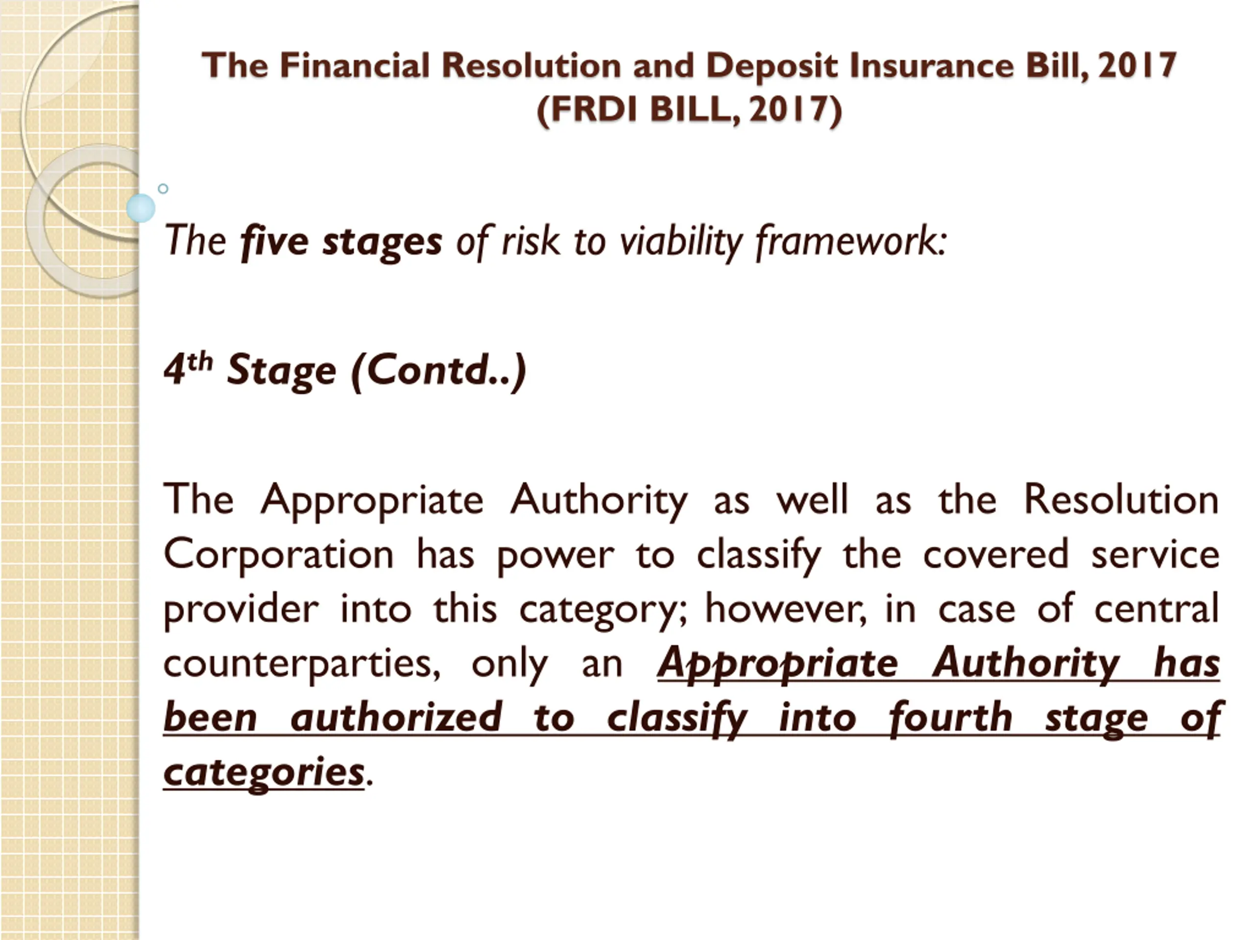 The Financial Resolution and Deposit Insurance Bill, 2017 (FRDI BILL, 2017) The five stages of risk to viability framework: 4thStage (Contd..) The Appropriate Authority as well as the Resolution Corporation has power to classify the covered service provider into this category; however, in case of central counterparties, only an Appropriate Authority has been authorized to classify into fourth stage of categories.