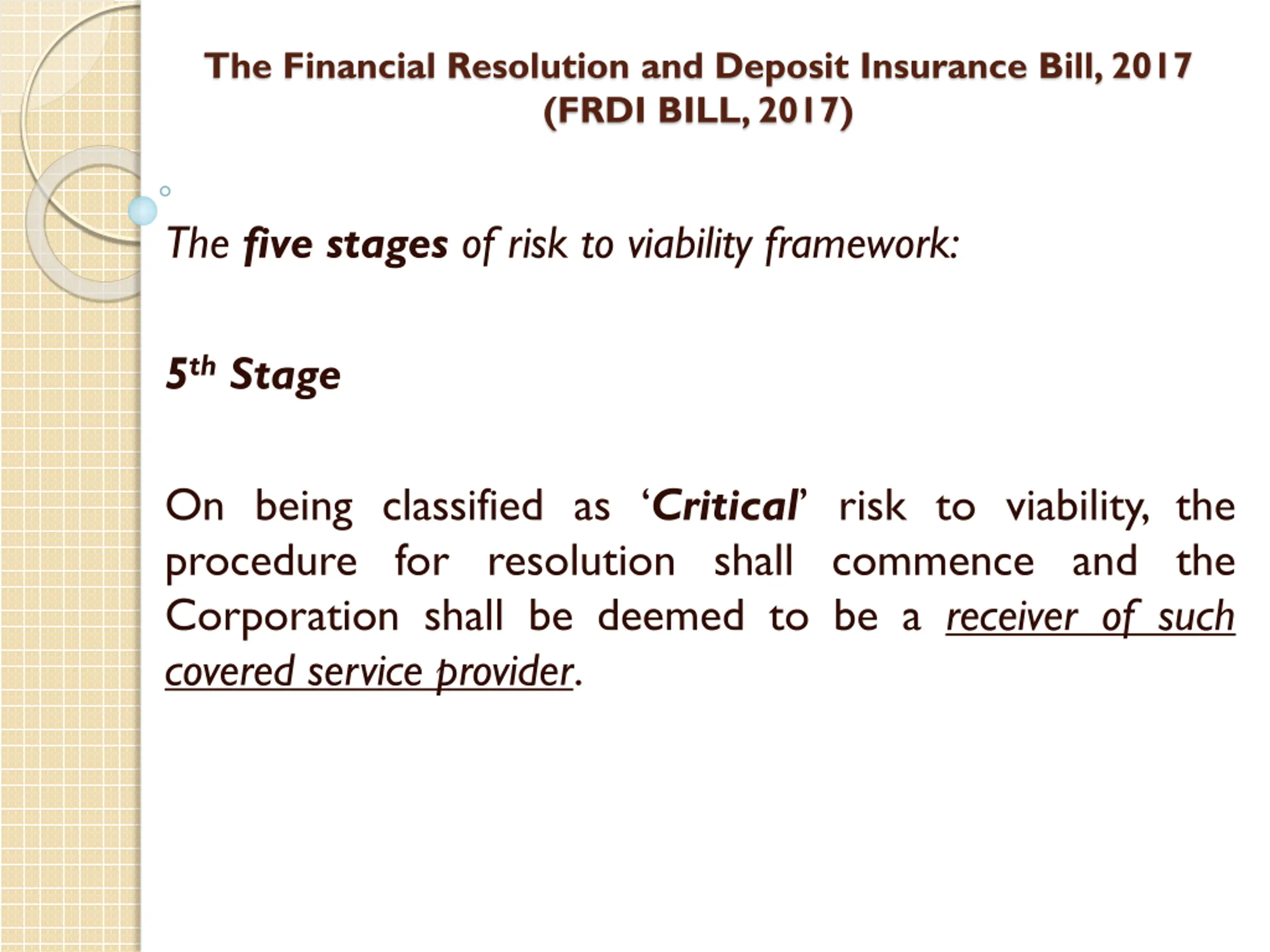 The Financial Resolution and Deposit Insurance Bill, 2017 (FRDI BILL, 2017) The five stages of risk to viability framework: 5thStage On being classified as Critical risk to viability, the procedure for resolution shall commence and the Corporation shall be deemed to be a receiver of such covered service provider.