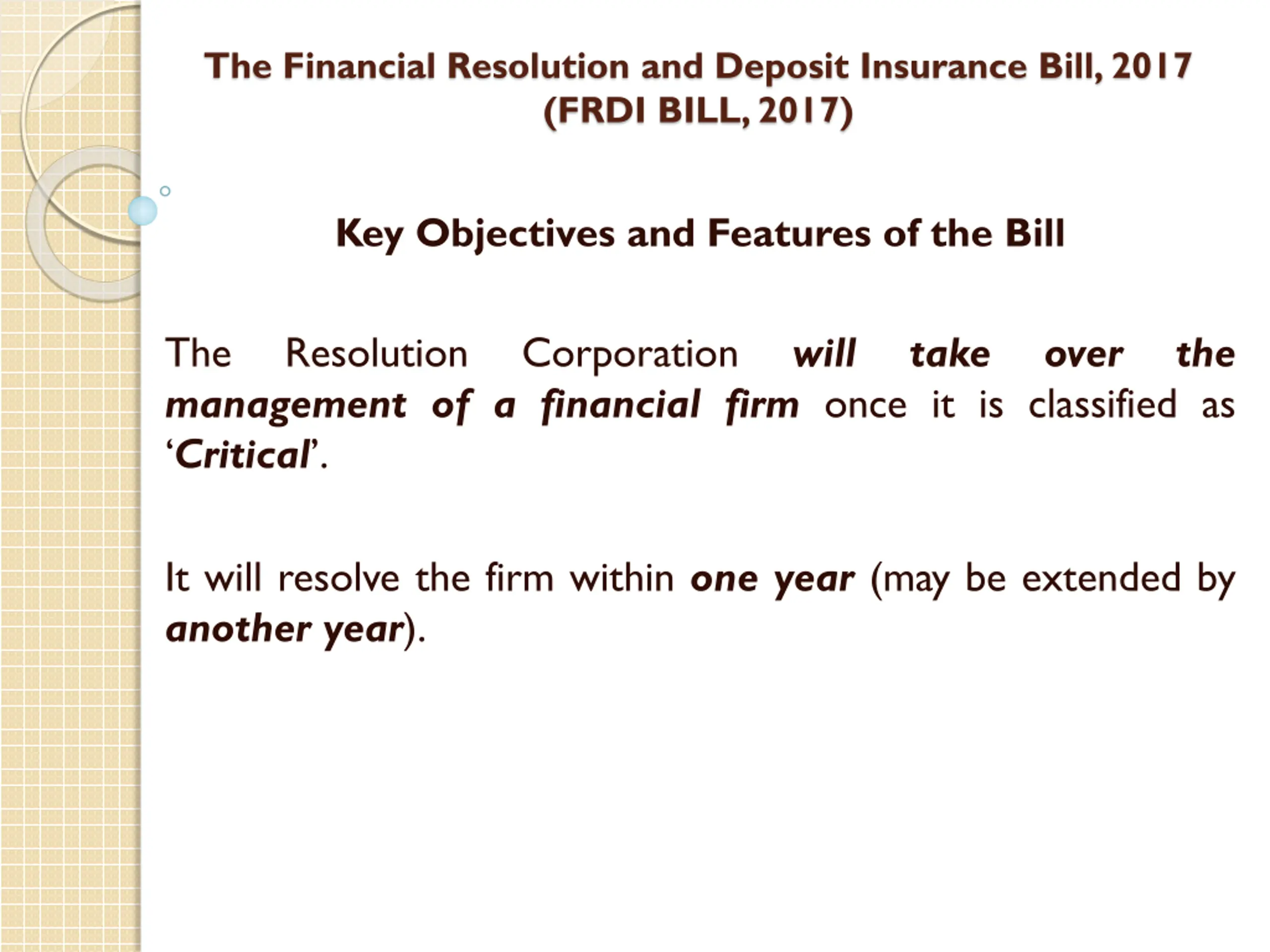 The Financial Resolution and Deposit Insurance Bill, 2017 (FRDI BILL, 2017) Key Objectives and Features of the Bill The management of a financial firm once it is classified as Critical . Resolution Corporation will take over the It will resolve the firm within one year (may be extended by another year).
