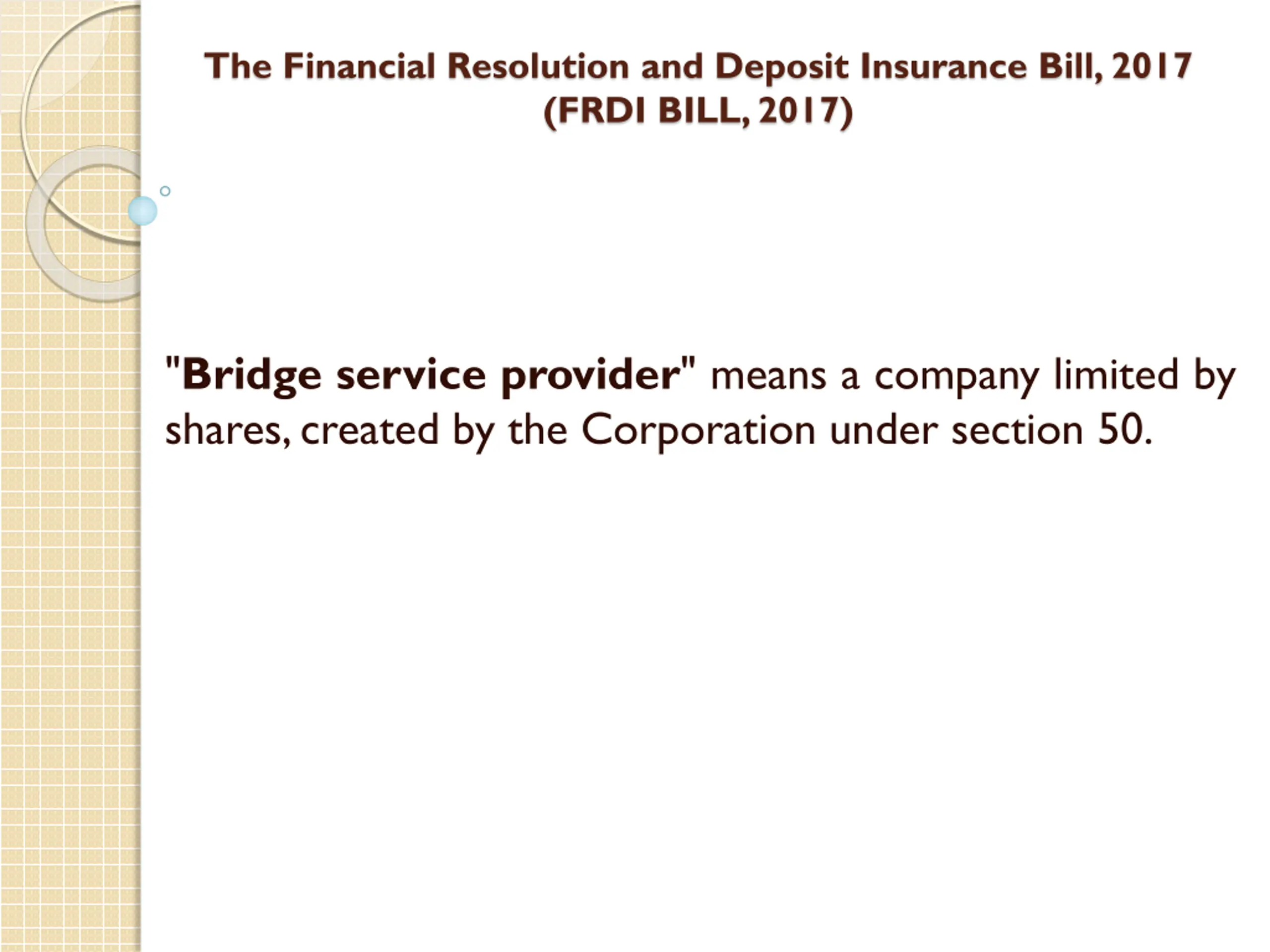 The Financial Resolution and Deposit Insurance Bill, 2017 (FRDI BILL, 2017) "Bridge service provider" means a company limited by shares,created by the Corporation under section 50.