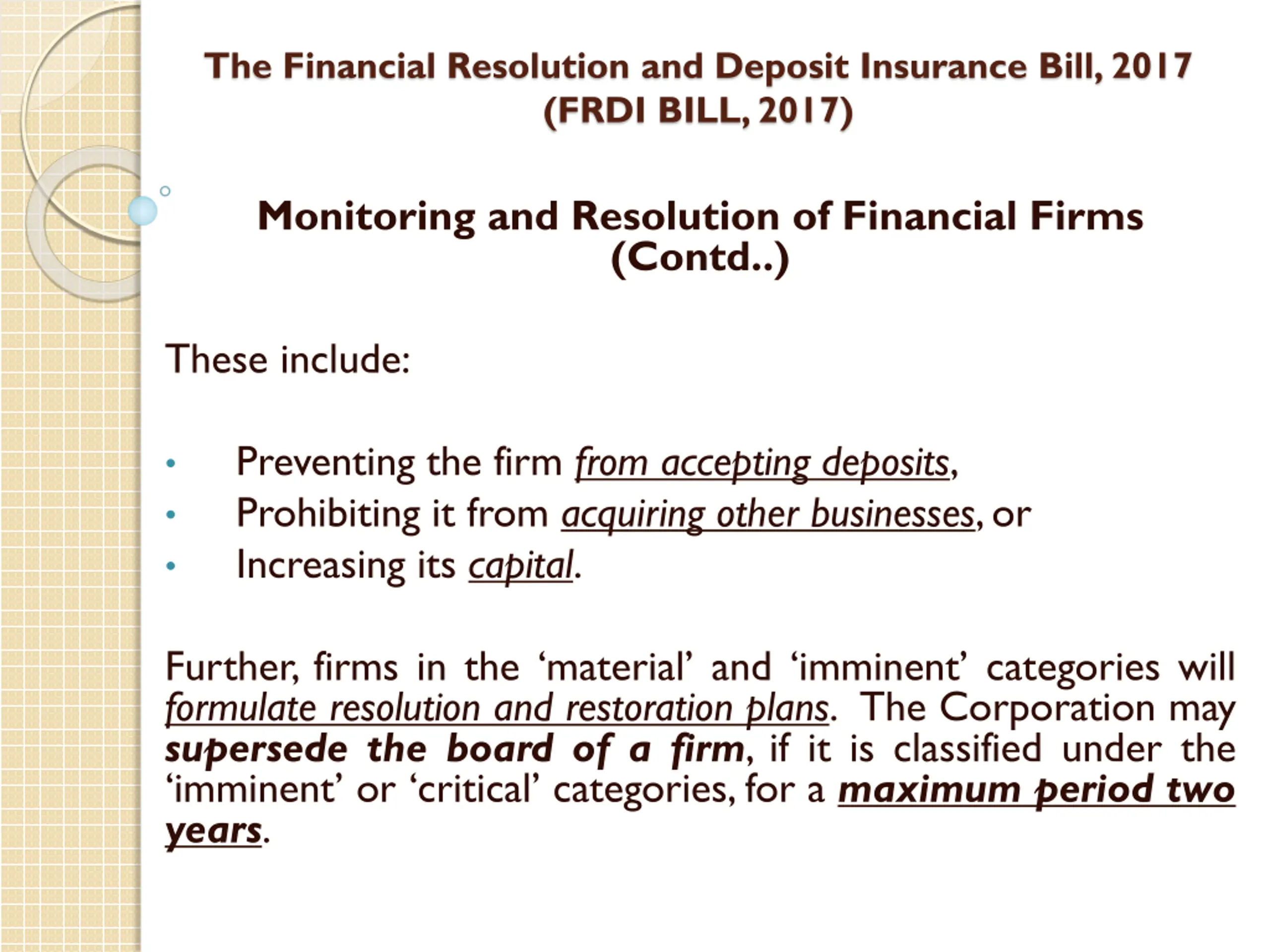 The Financial Resolution and Deposit Insurance Bill, 2017 (FRDI BILL, 2017) Monitoring and Resolution of Financial Firms (Contd..) These include: Preventing the firm from accepting deposits, Prohibiting it from acquiring other businesses, or Increasing its capital. Further, firms in the material and imminent categories will formulate resolution and restoration plans. The Corporation may supersede the board of a firm, if it is classified under the imminent or critical categories,for a maximum period two years.