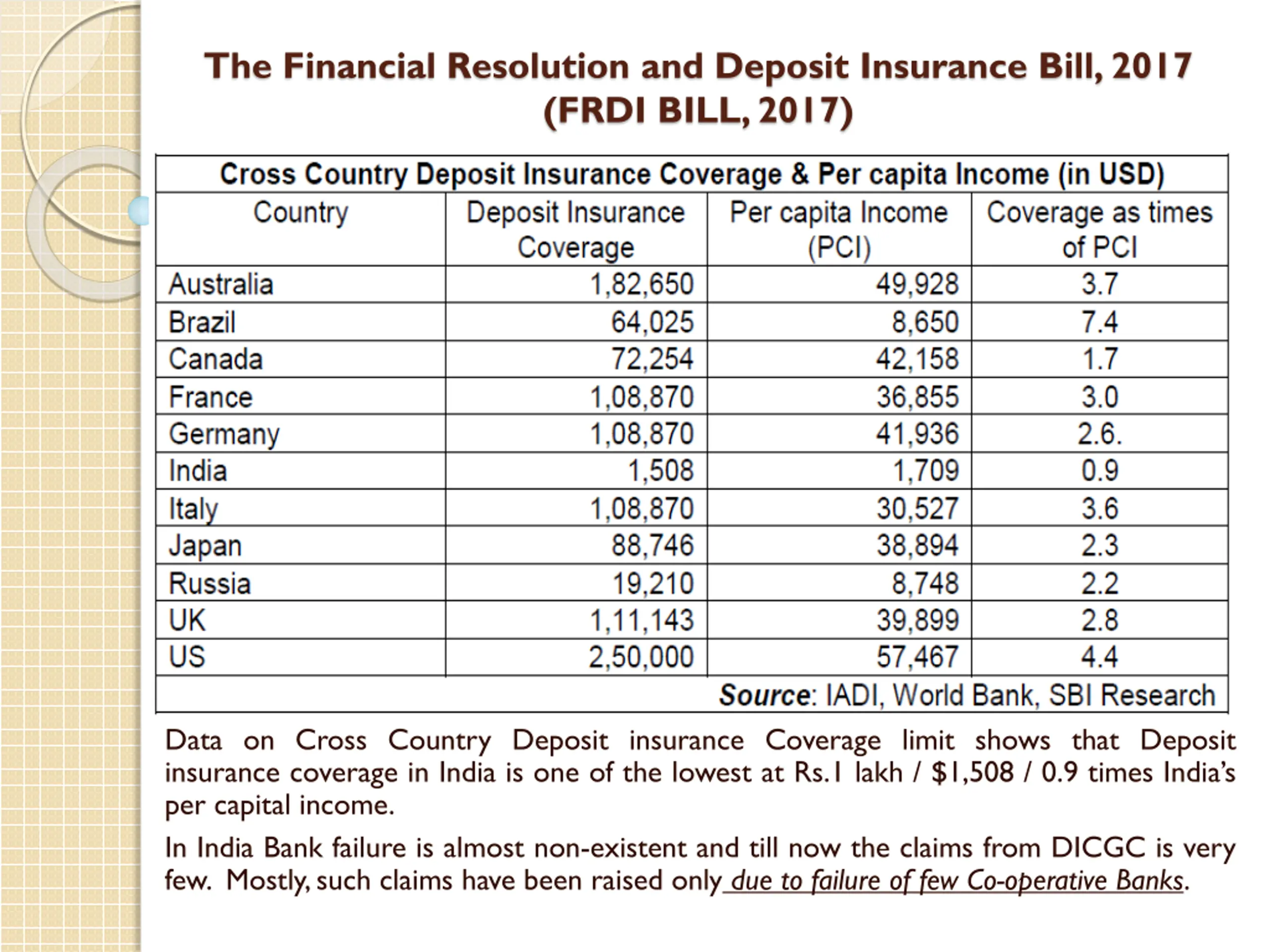 The Financial Resolution and Deposit Insurance Bill, 2017 (FRDI BILL, 2017) Data on Cross Country Deposit insurance Coverage limit shows that Deposit insurance coverage in India is one of the lowest at Rs.1 lakh / $1,508 / 0.9 times India s per capital income. In India Bank failure is almost non-existent and till now the claims from DICGC is very few. Mostly,such claims have been raised only due to failure of few Co-operative Banks.