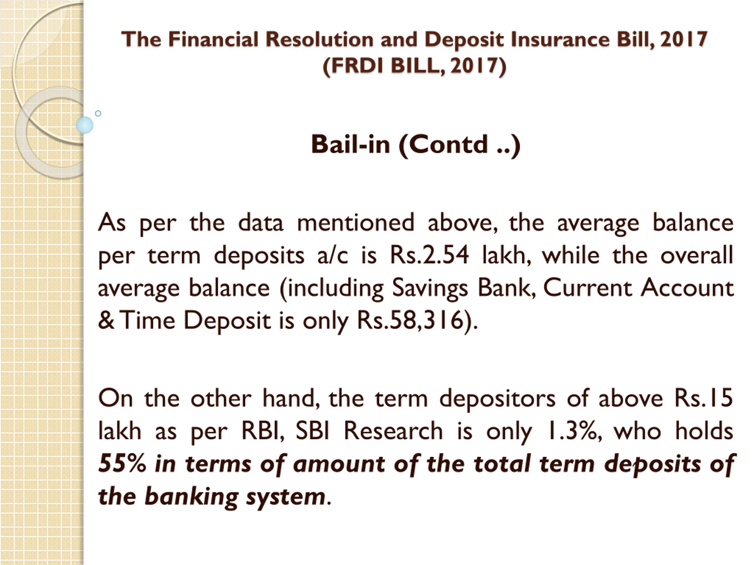 The Financial Resolution and Deposit Insurance Bill, 2017 (FRDI BILL, 2017) Bail-in (Contd ..) As per the data mentioned above, the average balance per term deposits a/c is Rs.2.54 lakh, while the overall average balance (including Savings Bank, Current Account &Time Deposit is only Rs.58,316). On the other hand, the term depositors of above Rs.15 lakh as per RBI, SBI Research is only 1.3%, who holds 55% in terms of amount of the total term deposits of the banking system.